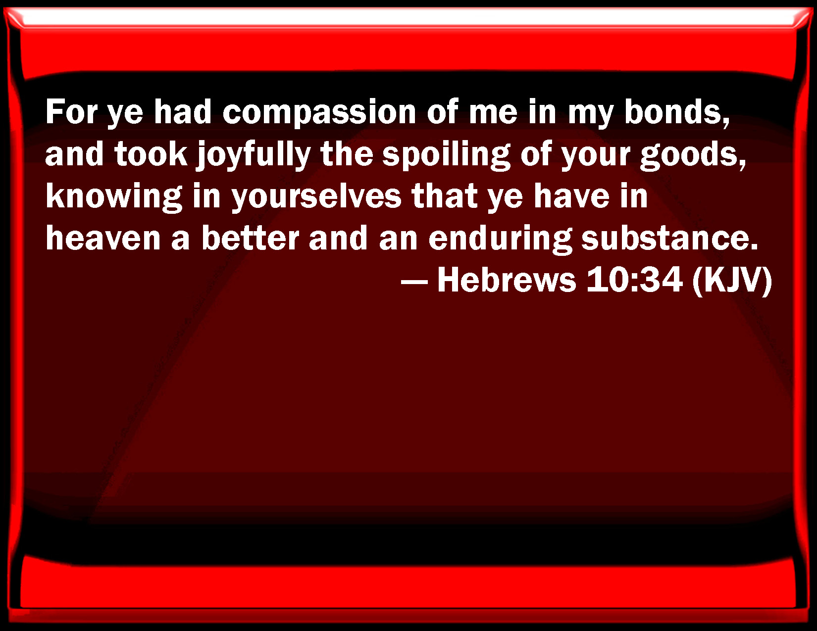 Bible Verse Slide Hebrews 10:34 For you had compassion of me in my bonds, and took joyfully the spoiling of your goods, knowing in yourselves that you have in heaven a better and an enduring substance. KJV: For ye had compassion of me in my bonds, and took joyfully the spoiling of your goods, knowing in yourselves that ye have in heaven a better and an enduring substance. DRB: For you both had compassion on them that were in bands, and took with joy the being stripped of your own goods, knowing that you have a better and a lasting substance. DBT: For ye both sympathised with prisoners and accepted with joy the plunder of your goods, knowing that ye have for yourselves a better substance, and an abiding one. ERV: For ye both had compassion on them that were in bonds, and took joyfully the spoiling of your possessions, knowing that ye yourselves have a better possession and an abiding one. WBT: For ye had compassion of me in my bonds, and took joyfully the seizing of your goods, knowing in yourselves that ye have in heaven a better and an enduring substance. WEB: For you both had compassion on me in my chains, and joyfully accepted the plundering of your possessions, knowing that you have for yourselves a better possession and an enduring one in the heavens. YLT: for also with my bonds ye sympathised, and the robbery of your goods with joy ye did receive, knowing that ye have in yourselves a better substance in the heavens, and an enduring one.Links Hebrews 10:34 NIV • Hebrews 10:34 NLT • Hebrews 10:34 ESV • Hebrews 10:34 NASB • Hebrews 10:34 KJV • Hebrews 10:34 Interlinear • Hebrews 10:34 Commentaries • Hebrews 10:34 Parallel Texts • Hebrews 10:34 Bible Apps • Hebrews 10:34 Parallel • Bible Hub |