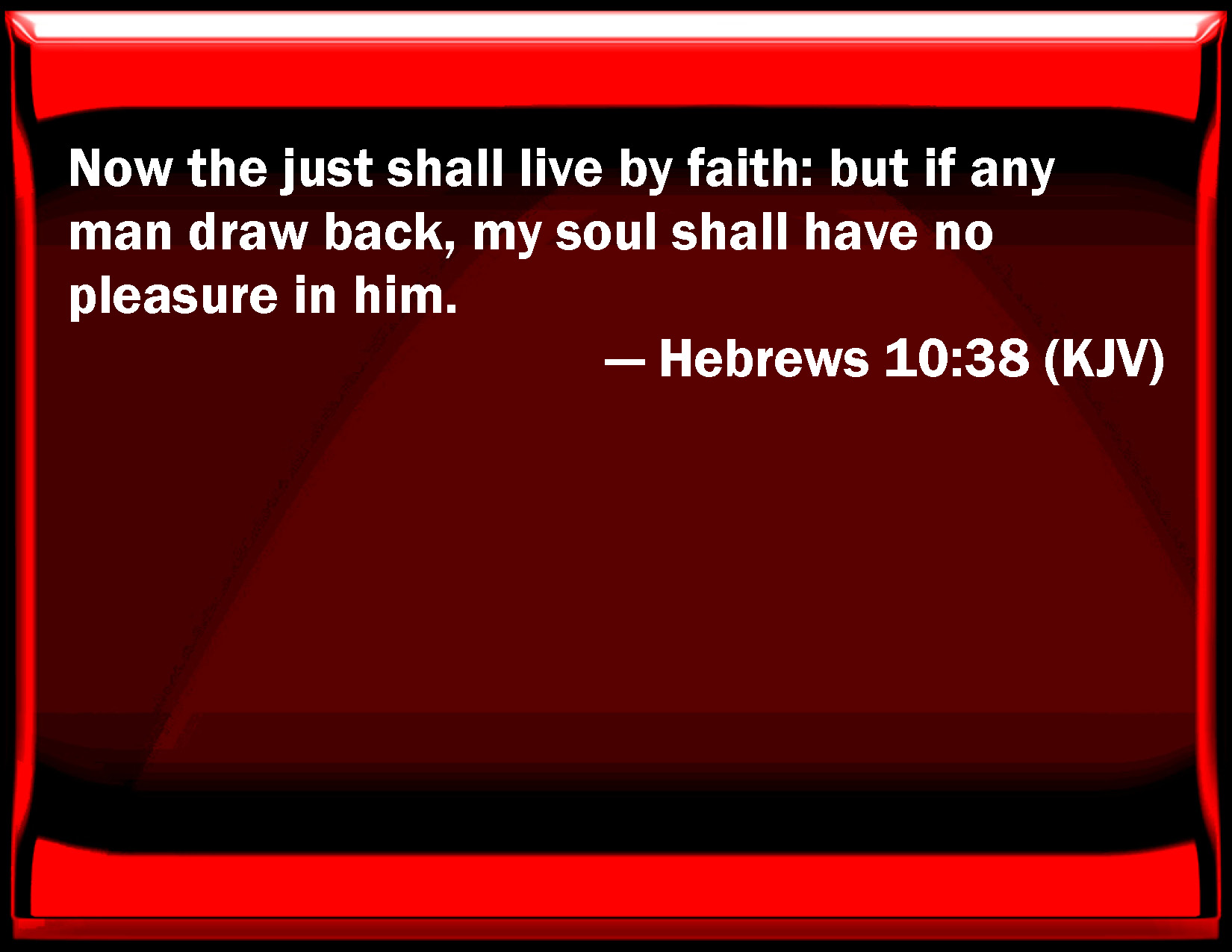 Bible Verse Slide Hebrews 10:38 Now the just shall live by faith: but if any man draw back, my soul shall have no pleasure in him. KJV: Now the just shall live by faith: but if any man draw back, my soul shall have no pleasure in him. DRB: But my just man liveth by faith; but if he withdraw himself, he shall not please my soul. DBT: But the just shall live by faith; and, if he draw back, my soul does not take pleasure in him. ERV: But my righteous one shall live by faith: And if he shrink back, my soul hath no pleasure in him. WBT: Now the just shall live by faith: but if any man shall draw back, my soul shall have no pleasure in him. WEB: But the righteous will live by faith. If he shrinks back, my soul has no pleasure in him." YLT: and 'the righteous by faith shall live,' and 'if he may draw back, My soul hath no pleasure in him,'Links Hebrews 10:38 NIV • Hebrews 10:38 NLT • Hebrews 10:38 ESV • Hebrews 10:38 NASB • Hebrews 10:38 KJV • Hebrews 10:38 Interlinear • Hebrews 10:38 Commentaries • Hebrews 10:38 Parallel Texts • Hebrews 10:38 Bible Apps • Hebrews 10:38 Parallel • Bible Hub |