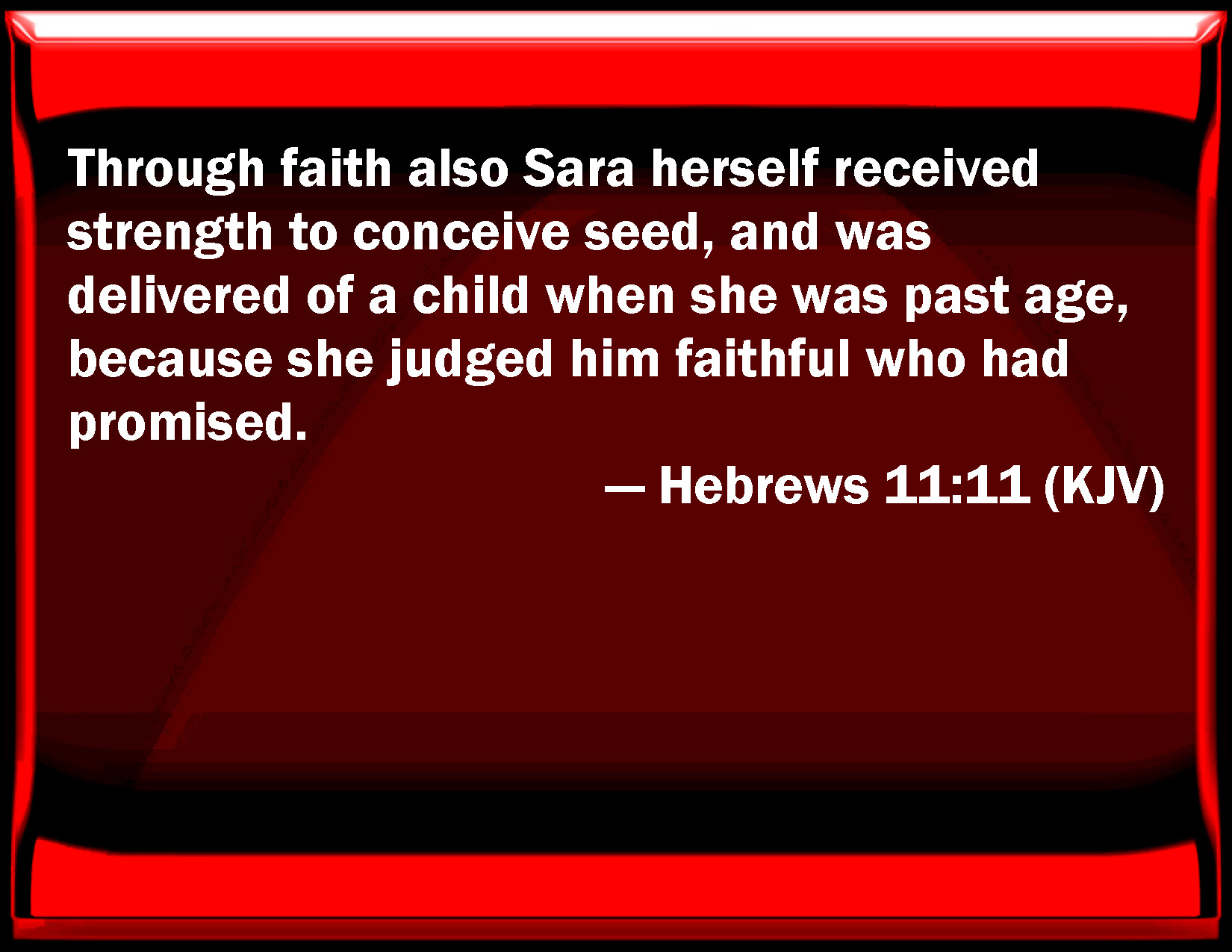 Bible Verse Slide Hebrews 11:11 Through faith also Sara herself received strength to conceive seed, and was delivered of a child when she was past age, because she judged him faithful who had promised. KJV: Through faith also Sara herself received strength to conceive seed, and was delivered of a child when she was past age, because she judged him faithful who had promised. DRB: By faith also Sara herself, being barren, received strength to conceive seed, even past the time of age; because she believed that he was faithful who had promised, DBT: By faith also Sarah herself received strength for the conception of seed, and that beyond a seasonable age; since she counted him faithful who promised. ERV: By faith even Sarah herself received power to conceive seed when she was past age, since she counted him faithful who had promised: WBT: Through faith also Sarah herself received strength to conceive seed, and was delivered of a child when she was past age, because she judged him faithful who had promised. WEB: By faith, even Sarah herself received power to conceive, and she bore a child when she was past age, since she counted him faithful who had promised. YLT: By faith also Sarah herself did receive power to conceive seed, and she bare after the time of life, seeing she did judge Him faithful who did promise;Links Hebrews 11:11 NIV • Hebrews 11:11 NLT • Hebrews 11:11 ESV • Hebrews 11:11 NASB • Hebrews 11:11 KJV • Hebrews 11:11 Interlinear • Hebrews 11:11 Commentaries • Hebrews 11:11 Parallel Texts • Hebrews 11:11 Bible Apps • Hebrews 11:11 Parallel • Bible Hub |