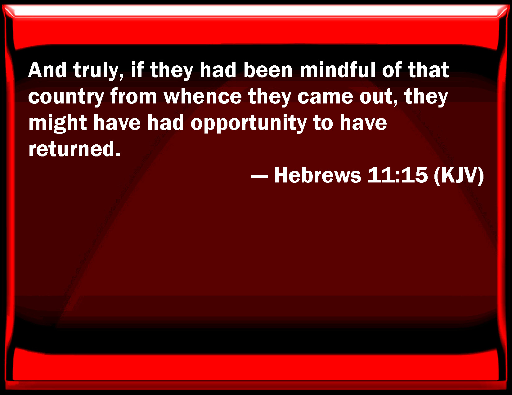 Bible Verse Slide Hebrews 11:15 And truly, if they had been mindful of that country from where they came out, they might have had opportunity to have returned. KJV: And truly, if they had been mindful of that country from whence they came out, they might have had opportunity to have returned. DRB: And truly if they had been mindful of that from whence they came out, they had doubtless time to return. DBT: And if they had called to mind that from whence they went out, they had had opportunity to have returned; ERV: And if indeed they had been mindful of that country from which they went out, they would have had opportunity to return. WBT: And truly, if they had been mindful of that country from whence they came, they might have had opportunity to return. WEB: If indeed they had been thinking of that country from which they went out, they would have had enough time to return. YLT: and if, indeed, they had been mindful of that from which they came forth, they might have had an opportunity to return,Links Hebrews 11:15 NIV • Hebrews 11:15 NLT • Hebrews 11:15 ESV • Hebrews 11:15 NASB • Hebrews 11:15 KJV • Hebrews 11:15 Interlinear • Hebrews 11:15 Commentaries • Hebrews 11:15 Parallel Texts • Hebrews 11:15 Bible Apps • Hebrews 11:15 Parallel • Bible Hub |