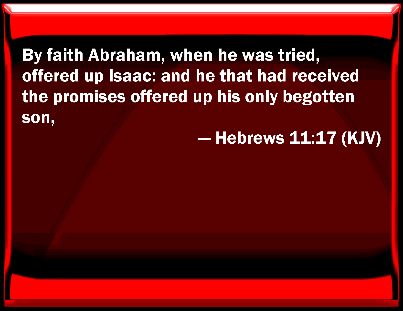 Bible Verse Slide Hebrews 11:17 By faith Abraham, when he was tried, offered up Isaac: and he that had received the promises offered up his only begotten son, KJV: By faith Abraham, when he was tried, offered up Isaac: and he that had received the promises offered up his only begotten son, DRB: By faith Abraham, when he was tried, offered Isaac: and he that had received the promises, offered up his only begotten son; DBT: By faith Abraham, when tried, offered up Isaac, and he who had received to himself the promises offered up his only begotten son, ERV: By faith Abraham, being tried, offered up Isaac: yea, he that had gladly received the promises was offering up his only begotten son; WBT: By faith Abraham, when he was tried, offered up Isaac: and he that had received the promises offered up his only-begotten son, WEB: By faith, Abraham, being tested, offered up Isaac. Yes, he who had gladly received the promises was offering up his one and only son; YLT: By faith Abraham hath offered up Isaac, being tried, and the only begotten he did offer up who did receive the promises,Links Hebrews 11:17 NIV • Hebrews 11:17 NLT • Hebrews 11:17 ESV • Hebrews 11:17 NASB • Hebrews 11:17 KJV • Hebrews 11:17 Interlinear • Hebrews 11:17 Commentaries • Hebrews 11:17 Parallel Texts • Hebrews 11:17 Bible Apps • Hebrews 11:17 Parallel • Bible Hub |