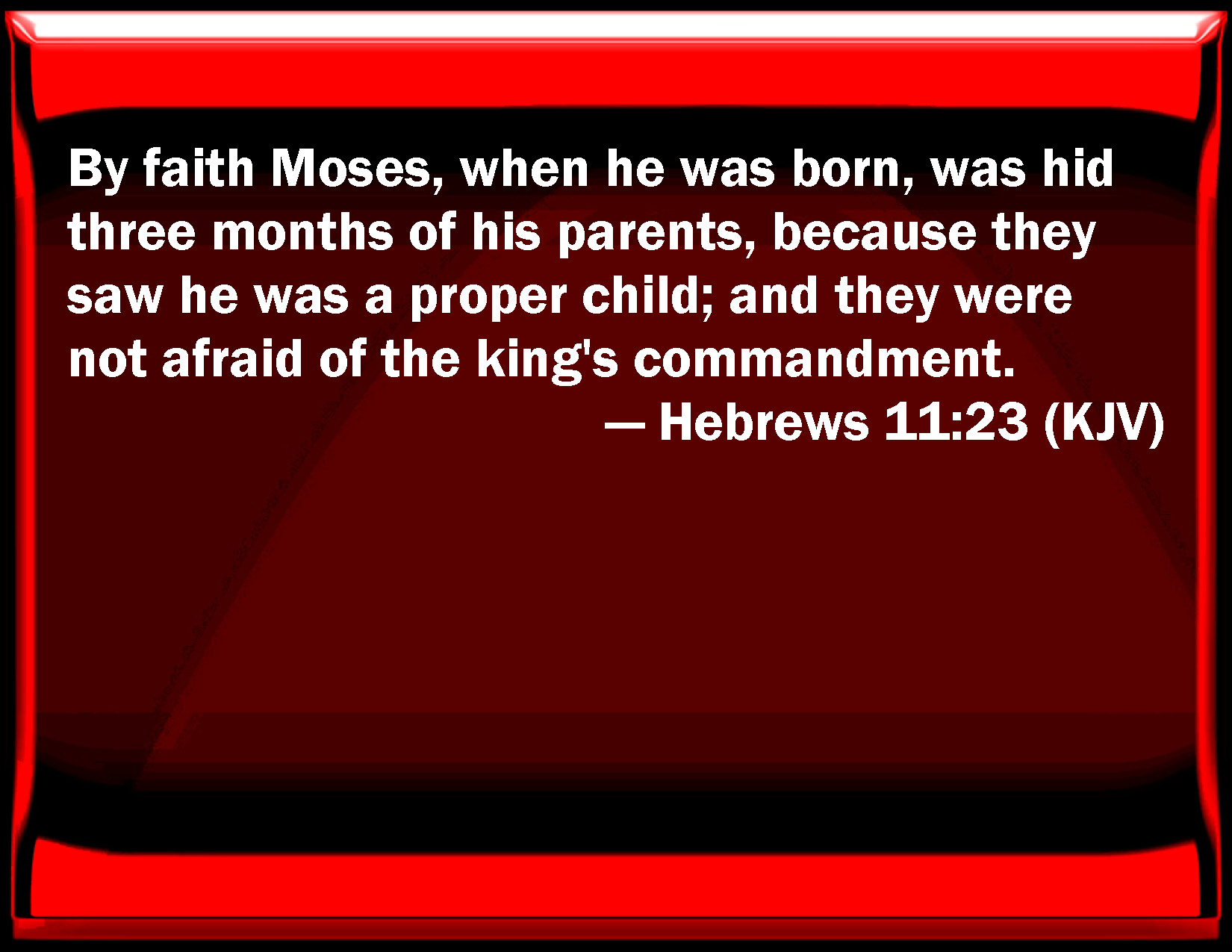 Bible Verse Slide Hebrews 11:23 By faith Moses, when he was born, was hid three months of his parents, because they saw he was a proper child; and they were not afraid of the king's commandment. KJV: By faith Moses, when he was born, was hid three months of his parents, because they saw he was a proper child; and they were not afraid of the king's commandment. DRB: By faith Moses, when he was born, was hid three months by his parents; because they saw he was a comely babe, and they feared not the king's edict. DBT: By faith Moses, being born, was hid three months by his parents, because they saw the child beautiful; and they did not fear the injunction of the king. ERV: By faith Moses, when he was born, was hid three months by his parents, because they saw he was a goodly child; and they were not afraid of the king's commandment. WBT: By faith Moses when he was born, was hid three months by his parents, because they saw he was a proper child; and they were not afraid of the king's commandment. WEB: By faith, Moses, when he was born, was hidden for three months by his parents, because they saw that he was a beautiful child, and they were not afraid of the king's commandment. YLT: By faith Moses, having been born, was hid three months by his parents, because they saw the child comely, and were not afraid of the decree of the king;Links Hebrews 11:23 NIV • Hebrews 11:23 NLT • Hebrews 11:23 ESV • Hebrews 11:23 NASB • Hebrews 11:23 KJV • Hebrews 11:23 Interlinear • Hebrews 11:23 Commentaries • Hebrews 11:23 Parallel Texts • Hebrews 11:23 Bible Apps • Hebrews 11:23 Parallel • Bible Hub |