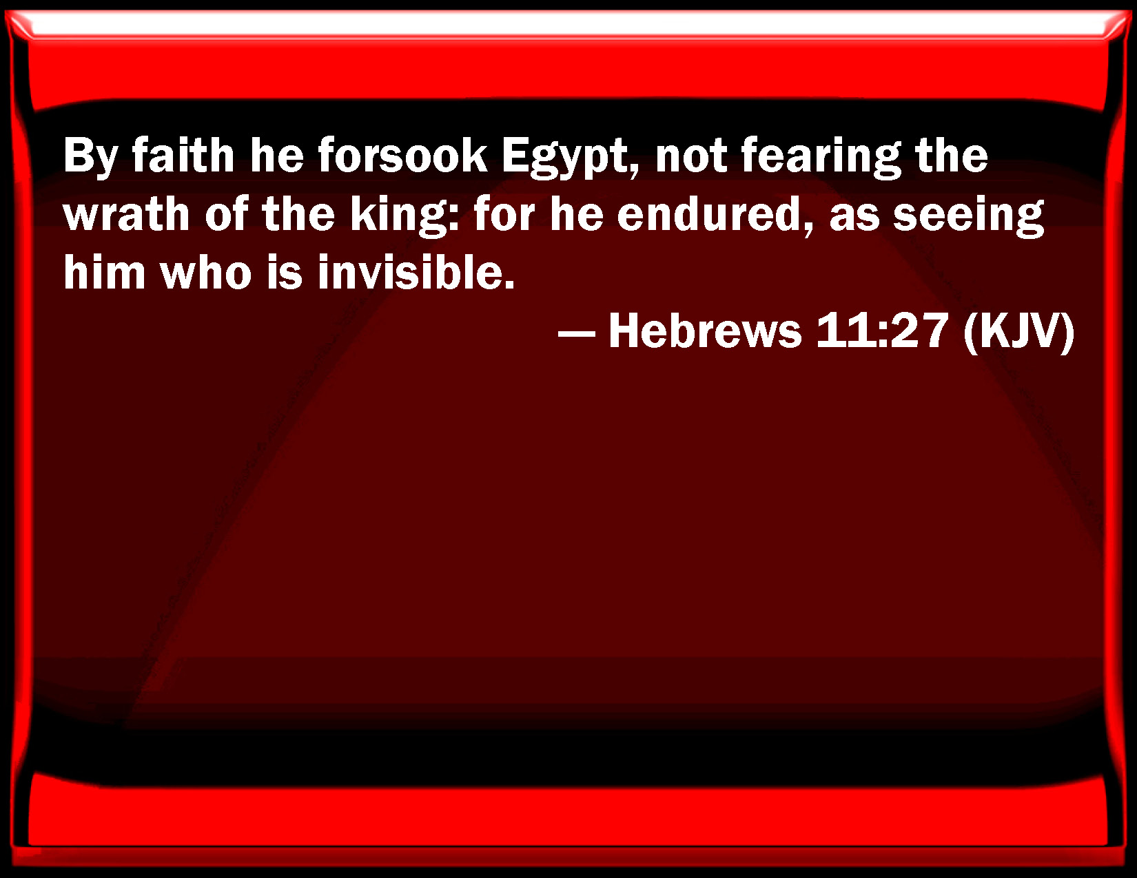 Bible Verse Slide Hebrews 11:27 By faith he forsook Egypt, not fearing the wrath of the king: for he endured, as seeing him who is invisible. KJV: By faith he forsook Egypt, not fearing the wrath of the king: for he endured, as seeing him who is invisible. DRB: By faith he left Egypt, not fearing the fierceness of the king: for he endured as seeing him that is invisible. DBT: By faith he left Egypt, not fearing the wrath of the king; for he persevered, as seeing him who is invisible. ERV: By faith he forsook Egypt, not fearing the wrath of the king: for he endured, as seeing him who is invisible. WBT: By faith he forsook Egypt, not fearing the wrath of the king: for he endured, as seeing him who is invisible. WEB: By faith, he left Egypt, not fearing the wrath of the king; for he endured, as seeing him who is invisible. YLT: by faith he left Egypt behind, not having been afraid of the wrath of the king, for, as seeing the Invisible One — he endured;Links Hebrews 11:27 NIV • Hebrews 11:27 NLT • Hebrews 11:27 ESV • Hebrews 11:27 NASB • Hebrews 11:27 KJV • Hebrews 11:27 Interlinear • Hebrews 11:27 Commentaries • Hebrews 11:27 Parallel Texts • Hebrews 11:27 Bible Apps • Hebrews 11:27 Parallel • Bible Hub |