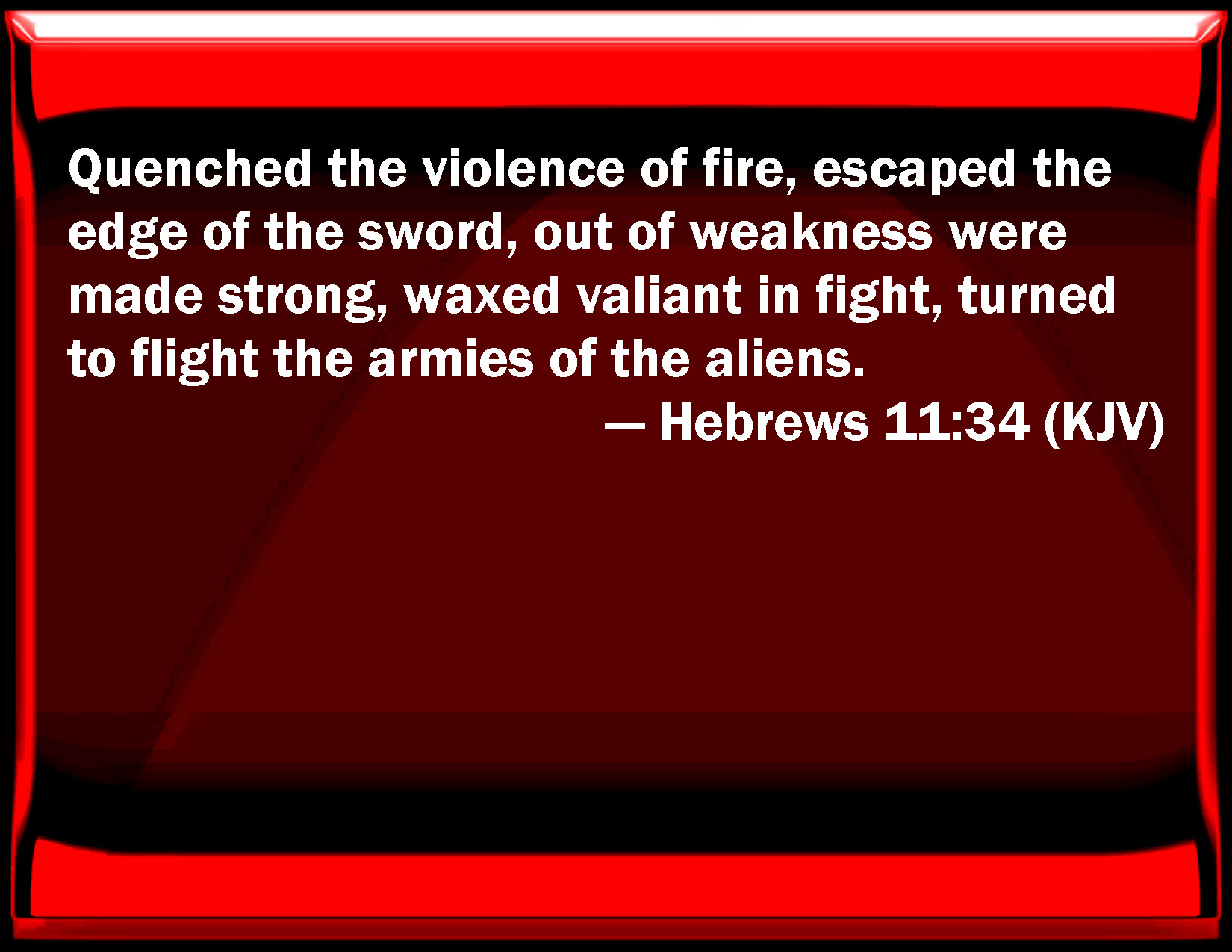 Bible Verse Slide Hebrews 11:34 Quenched the violence of fire, escaped the edge of the sword, out of weakness were made strong, waxed valiant in fight, turned to flight the armies of the aliens. KJV: Quenched the violence of fire, escaped the edge of the sword, out of weakness were made strong, waxed valiant in fight, turned to flight the armies of the aliens. DRB: Quenched the violence of fire, escaped the edge of the sword, recovered strength from weakness, became valiant in battle, put to flight the armies of foreigners: DBT: quenched the power of fire, escaped the edge of the sword, became strong out of weakness, became mighty in war, made the armies of strangers give way. ERV: quenched the power of fire, escaped the edge of the sword, from weakness were made strong, waxed mighty in war, turned to flight armies of aliens. WBT: Quenched the violence of fire, escaped the edge of the sword, out of weakness were made strong, became valiant in fight, turned to flight the armies of the aliens. WEB: quenched the power of fire, escaped the edge of the sword, from weakness were made strong, grew mighty in war, and caused foreign armies to flee. YLT: quenched the power of fire, escaped the mouth of the sword, were made powerful out of infirmities, became strong in battle, caused to give way camps of the aliens.Links Hebrews 11:34 NIV • Hebrews 11:34 NLT • Hebrews 11:34 ESV • Hebrews 11:34 NASB • Hebrews 11:34 KJV • Hebrews 11:34 Interlinear • Hebrews 11:34 Commentaries • Hebrews 11:34 Parallel Texts • Hebrews 11:34 Bible Apps • Hebrews 11:34 Parallel • Bible Hub |