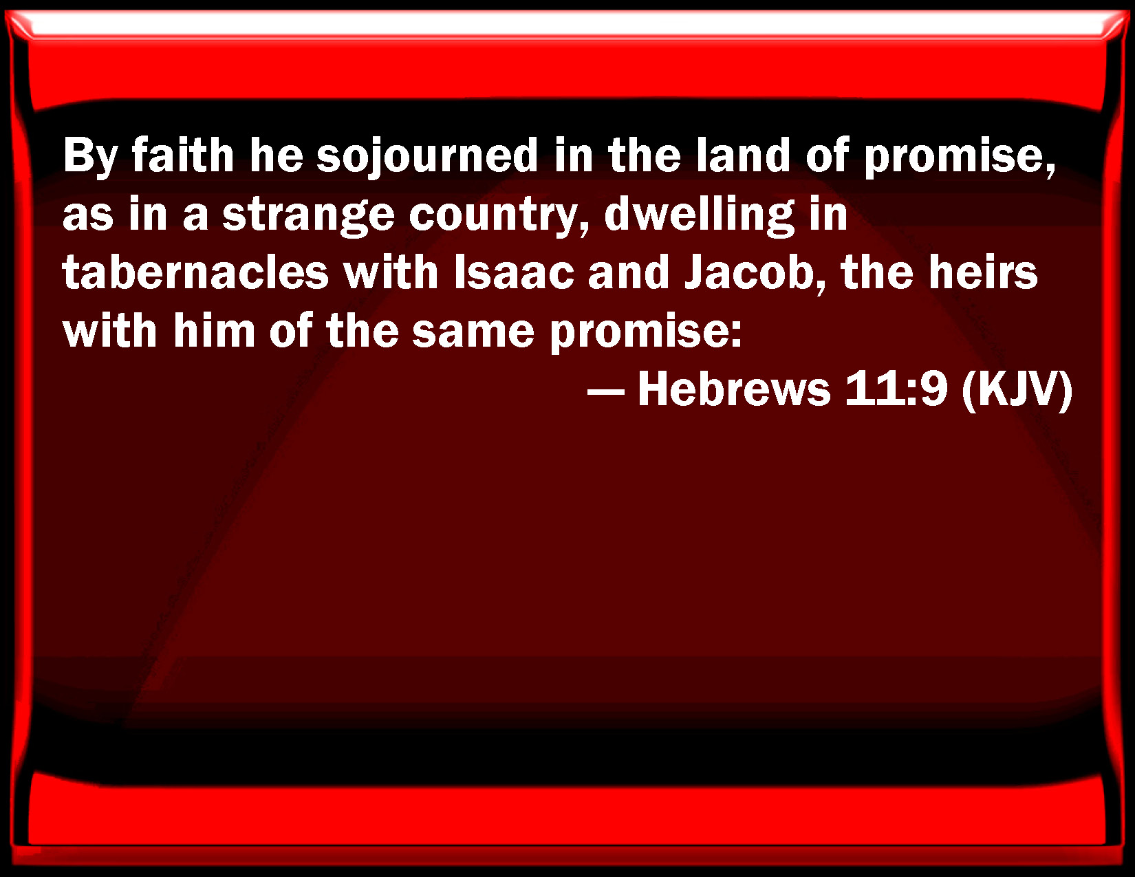 Bible Verse Slide Hebrews 11:9 By faith he sojourned in the land of promise, as in a strange country, dwelling in tabernacles with Isaac and Jacob, the heirs with him of the same promise: KJV: By faith he sojourned in the land of promise, as in a strange country, dwelling in tabernacles with Isaac and Jacob, the heirs with him of the same promise: DRB: By faith he abode in the land, dwelling in cottages, with Isaac and Jacob, the co-heirs of the same promise. DBT: By faith he sojourned as a stranger in the land of promise as a foreign country, having dwelt in tents with Isaac and Jacob, the heirs with him of the same promise; ERV: By faith he became a sojourner in the land of promise, as in a land not his own, dwelling in tents, with Isaac and Jacob, the heirs with him of the same promise: WBT: By faith he sojourned in the land of promise, as in a foreign country, dwelling in tabernacles with Isaac and Jacob, the heirs with him of the same promise: WEB: By faith, he lived as an alien in the land of promise, as in a land not his own, dwelling in tents, with Isaac and Jacob, the heirs with him of the same promise. YLT: by faith he did sojourn in the land of the promise as a strange country, in tabernacles having dwelt with Isaac and Jacob, fellow-heirs of the same promise,Links Hebrews 11:9 NIV • Hebrews 11:9 NLT • Hebrews 11:9 ESV • Hebrews 11:9 NASB • Hebrews 11:9 KJV • Hebrews 11:9 Interlinear • Hebrews 11:9 Commentaries • Hebrews 11:9 Parallel Texts • Hebrews 11:9 Bible Apps • Hebrews 11:9 Parallel • Bible Hub |