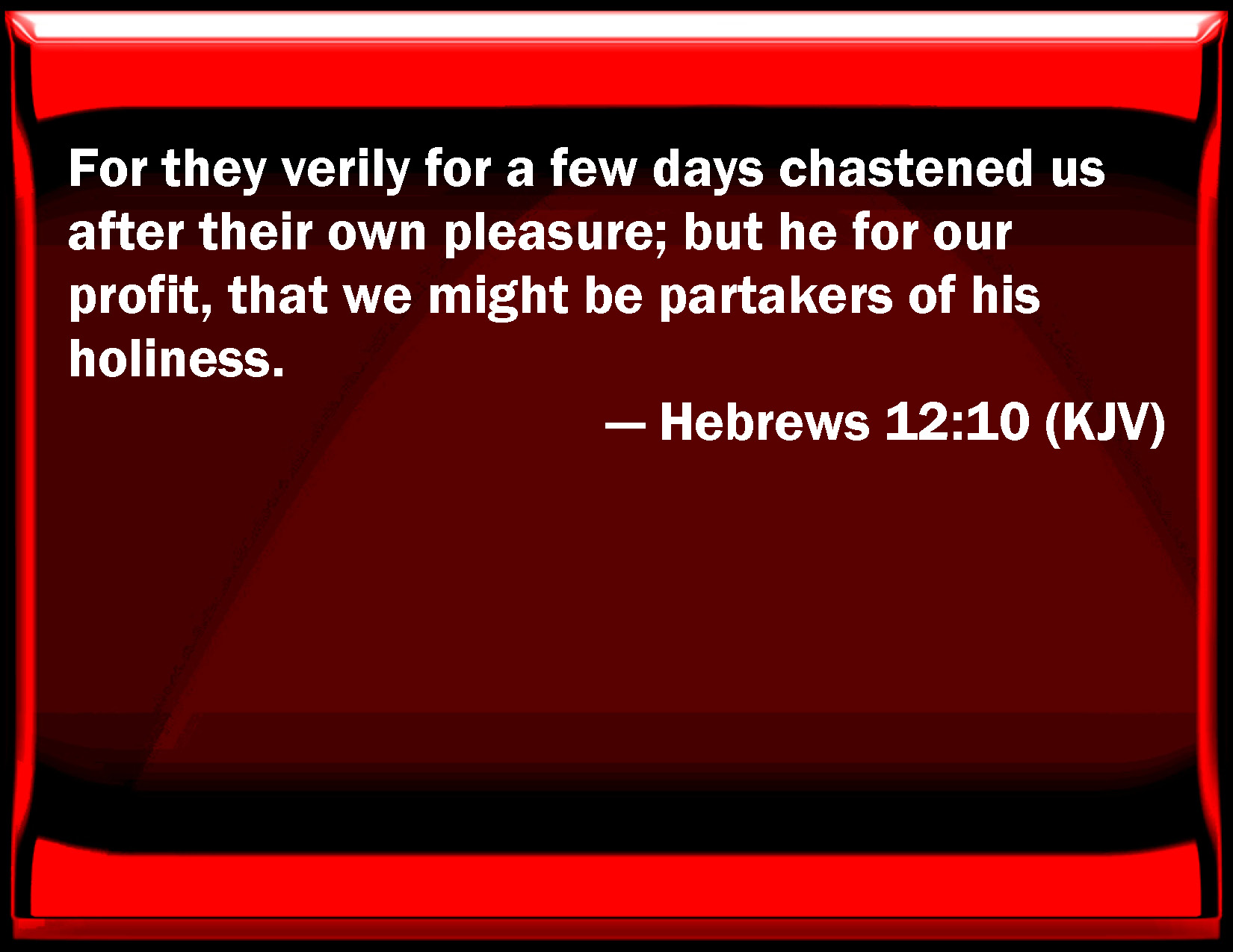 Bible Verse Slide Hebrews 12:10 For they truly for a few days chastened us after their own pleasure; but he for our profit, that we might be partakers of his holiness. KJV: For they verily for a few days chastened us after their own pleasure; but he for our profit, that we might be partakers of his holiness. DRB: And they indeed for a few days, according to their own pleasure, instructed us: but he, for our profit, that we might receive his sanctification. DBT: For they indeed chastened for a few days, as seemed good to them; but he for profit, in order to the partaking of his holiness. ERV: For they verily for a few days chastened us as seemed good to them; but he for our profit, that we may be partakers of his holiness. WBT: For they verily for a few days chastened us after their own pleasure; but he for our profit, that we might be partakers of his holiness. WEB: For they indeed, for a few days, punished us as seemed good to them; but he for our profit, that we may be partakers of his holiness. YLT: for they, indeed, for a few days, according to what seemed good to them, were chastening, but He for profit, to be partakers of His separation;Links Hebrews 12:10 NIV • Hebrews 12:10 NLT • Hebrews 12:10 ESV • Hebrews 12:10 NASB • Hebrews 12:10 KJV • Hebrews 12:10 Interlinear • Hebrews 12:10 Commentaries • Hebrews 12:10 Parallel Texts • Hebrews 12:10 Bible Apps • Hebrews 12:10 Parallel • Bible Hub |