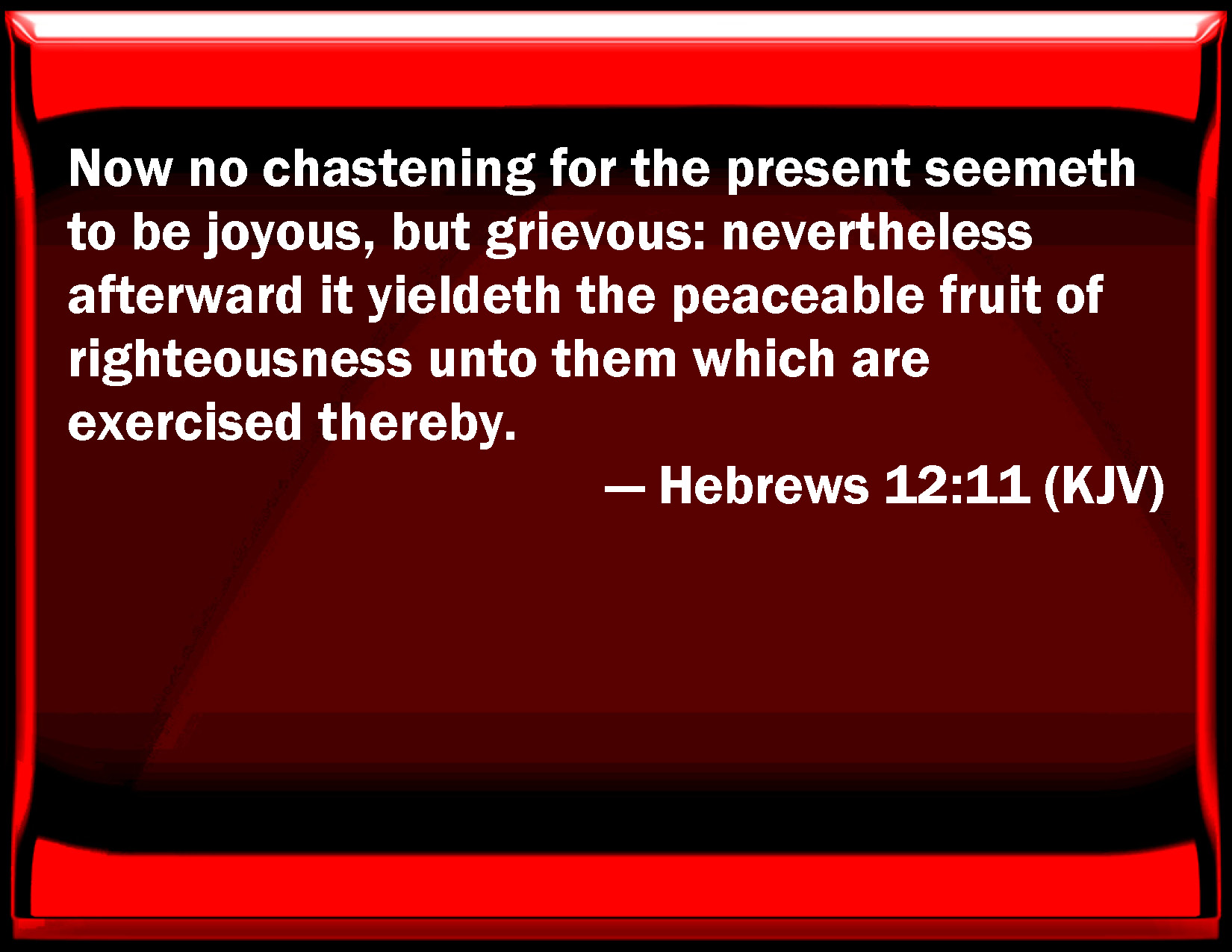 Bible Verse Slide Hebrews 12:11 Now no chastening for the present seems to be joyous, but grievous: nevertheless afterward it yields the peaceable fruit of righteousness to them which are exercised thereby. KJV: Now no chastening for the present seemeth to be joyous, but grievous: nevertheless afterward it yieldeth the peaceable fruit of righteousness unto them which are exercised thereby. DRB: Now all chastisement for the present indeed seemeth not to bring with it joy, but sorrow: but afterwards it will yield, to them that are exercised by it, the most peaceable fruit of justice. DBT: But no chastening at the time seems to be matter of joy, but of grief; but afterwards yields the peaceful fruit of righteousness to those exercised by it. ERV: All chastening seemeth for the present to be not joyous, but grievous: yet afterward it yieldeth peaceable fruit unto them that have been exercised thereby, even the fruit of righteousness. WBT: Now no chastening for the present seemeth to be joyous, but grievous: nevertheless, afterward it yieldeth the peaceable fruit of righteousness to them who are exercised by it. WEB: All chastening seems for the present to be not joyous but grievous; yet afterward it yields the peaceful fruit of righteousness to those who have been exercised thereby. YLT: and all chastening for the present, indeed, doth not seem to be of joy, but of sorrow, yet afterward the peaceable fruit of righteousness to those exercised through it — it doth yield.Links Hebrews 12:11 NIV • Hebrews 12:11 NLT • Hebrews 12:11 ESV • Hebrews 12:11 NASB • Hebrews 12:11 KJV • Hebrews 12:11 Interlinear • Hebrews 12:11 Commentaries • Hebrews 12:11 Parallel Texts • Hebrews 12:11 Bible Apps • Hebrews 12:11 Parallel • Bible Hub |