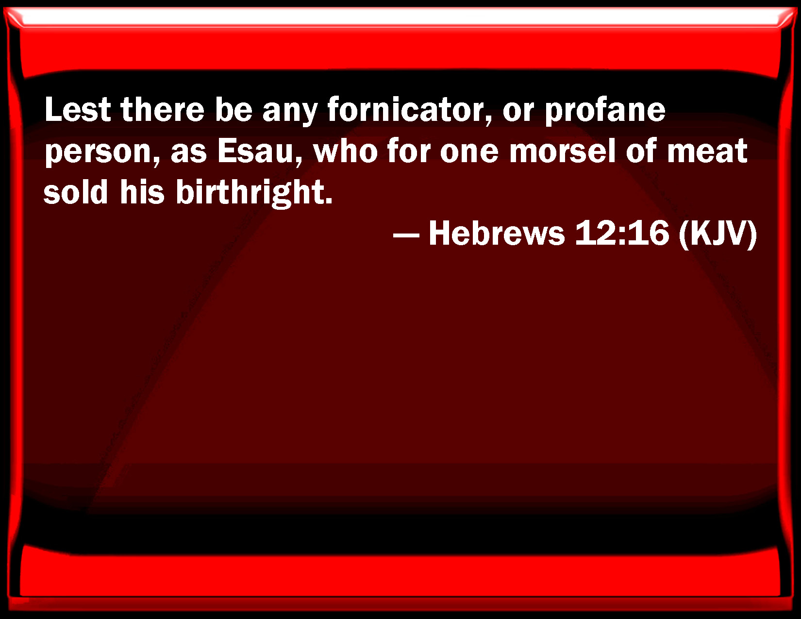 Bible Verse Slide Hebrews 12:16 Lest there be any fornicator, or profane person, as Esau, who for one morsel of meat sold his birthright. KJV: Lest there be any fornicator, or profane person, as Esau, who for one morsel of meat sold his birthright. DRB: Lest there be any fornicator, or profane person, as Esau; who for one mess, sold his first birthright. DBT: lest there be any fornicator, or profane person, as Esau, who for one meal sold his birthright; ERV: lest there be any fornicator, or profane person, as Esau, who for one mess of meat sold his own birthright. WBT: Lest there be any fornicator, or profane person, as Esau, who for one morsel of food sold his birth-right. WEB: lest there be any sexually immoral person, or profane person, like Esau, who sold his birthright for one meal. YLT: lest any one be a fornicator, or a profane person, as Esau, who in exchange for one morsel of food did sell his birthright,Links Hebrews 12:16 NIV • Hebrews 12:16 NLT • Hebrews 12:16 ESV • Hebrews 12:16 NASB • Hebrews 12:16 KJV • Hebrews 12:16 Interlinear • Hebrews 12:16 Commentaries • Hebrews 12:16 Parallel Texts • Hebrews 12:16 Bible Apps • Hebrews 12:16 Parallel • Bible Hub |