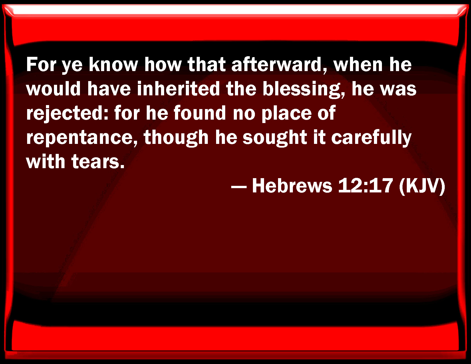 Bible Verse Slide Hebrews 12:17 For you know how that afterward, when he would have inherited the blessing, he was rejected: for he found no place of repentance, though he sought it carefully with tears. KJV: For ye know how that afterward, when he would have inherited the blessing, he was rejected: for he found no place of repentance, though he sought it carefully with tears. DRB: For know ye that afterwards, when he desired to inherit the benediction, he was rejected; for he found no place of repentance, although with tears he had sought it. DBT: for ye know that also afterwards, desiring to inherit the blessing, he was rejected, (for he found no place for repentance) although he sought it earnestly with tears. ERV: For ye know that even when he afterward desired to inherit the blessing, he was rejected (for he found no place of repentance), though he sought it diligently with tears. WBT: For ye know that afterward, when he would have inherited the blessing, he was rejected: for he found no place of repentance, though he sought it carefully with tears. WEB: For you know that even when he afterward desired to inherit the blessing, he was rejected, for he found no place for a change of mind though he sought it diligently with tears. YLT: for ye know that also afterwards, wishing to inherit the blessing, he was disapproved of, for a place of reformation he found not, though with tears having sought it.Links Hebrews 12:17 NIV • Hebrews 12:17 NLT • Hebrews 12:17 ESV • Hebrews 12:17 NASB • Hebrews 12:17 KJV • Hebrews 12:17 Interlinear • Hebrews 12:17 Commentaries • Hebrews 12:17 Parallel Texts • Hebrews 12:17 Bible Apps • Hebrews 12:17 Parallel • Bible Hub |