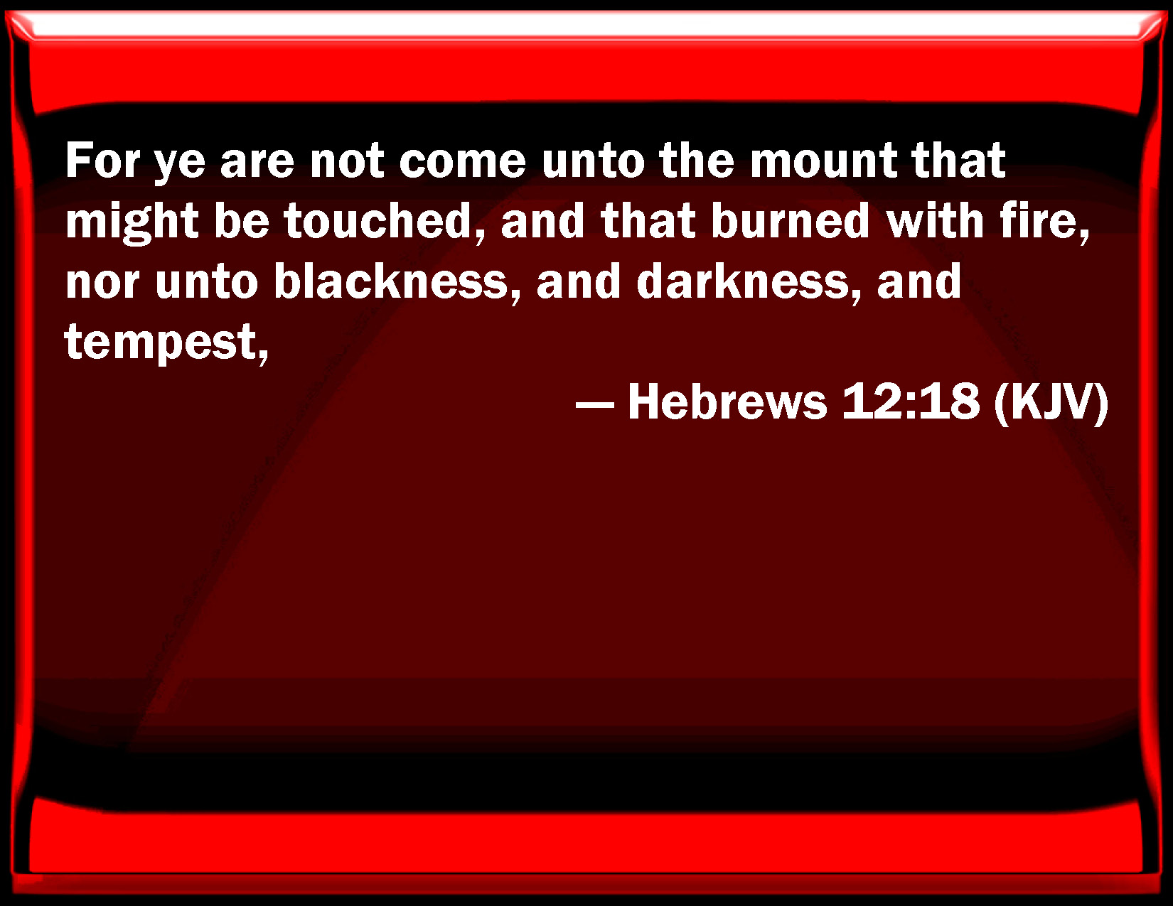 Bible Verse Slide Hebrews 12:18 For you are not come to the mount that might be touched, and that burned with fire, nor to blackness, and darkness, and tempest, KJV: For ye are not come unto the mount that might be touched, and that burned with fire, nor unto blackness, and darkness, and tempest, DRB: For you are not come to a mountain that might be touched, and a burning fire, and a whirlwind, and darkness, and storm, DBT: For ye have not come to the mount that might be touched and was all on fire, and to obscurity, and darkness, and tempest, ERV: For ye are not come unto a mount that might be touched, and that burned with fire, and unto blackness, and darkness, and tempest, WBT: For ye are not come to the mount that might be touched, and that burned with fire, nor to blackness, and to darkness, and tempest, WEB: For you have not come to a mountain that might be touched, and that burned with fire, and to blackness, darkness, storm, YLT: For ye came not near to the mount touched and scorched with fire, and to blackness, and darkness, and tempest,Links Hebrews 12:18 NIV • Hebrews 12:18 NLT • Hebrews 12:18 ESV • Hebrews 12:18 NASB • Hebrews 12:18 KJV • Hebrews 12:18 Interlinear • Hebrews 12:18 Commentaries • Hebrews 12:18 Parallel Texts • Hebrews 12:18 Bible Apps • Hebrews 12:18 Parallel • Bible Hub |