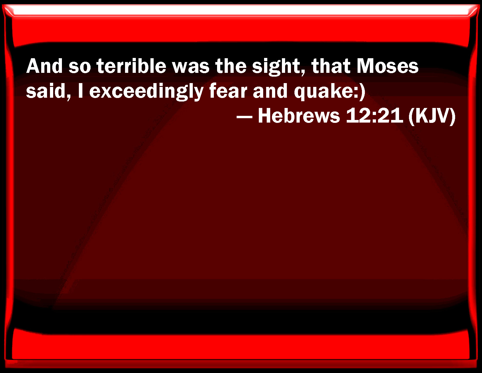 Bible Verse Slide Hebrews 12:21 And so terrible was the sight, that Moses said, I exceedingly fear and quake:) KJV: And so terrible was the sight, that Moses said, I exceedingly fear and quake:) DRB: And so terrible was that which was seen, Moses said: I am frighted, and tremble. DBT: and, so fearful was the sight, Moses said, I am exceedingly afraid and full of trembling;) ERV: and so fearful was the appearance, that Moses said, I exceedingly fear and quake: WBT: And so terrible was the sight, that Moses said, I exceedingly fear and tremble:) WEB: and so fearful was the appearance, that Moses said, "I am terrified and trembling." YLT: and, (so terrible was the sight,) Moses said, 'I am fearful exceedingly, and trembling.'Links Hebrews 12:21 NIV • Hebrews 12:21 NLT • Hebrews 12:21 ESV • Hebrews 12:21 NASB • Hebrews 12:21 KJV • Hebrews 12:21 Interlinear • Hebrews 12:21 Commentaries • Hebrews 12:21 Parallel Texts • Hebrews 12:21 Bible Apps • Hebrews 12:21 Parallel • Bible Hub |