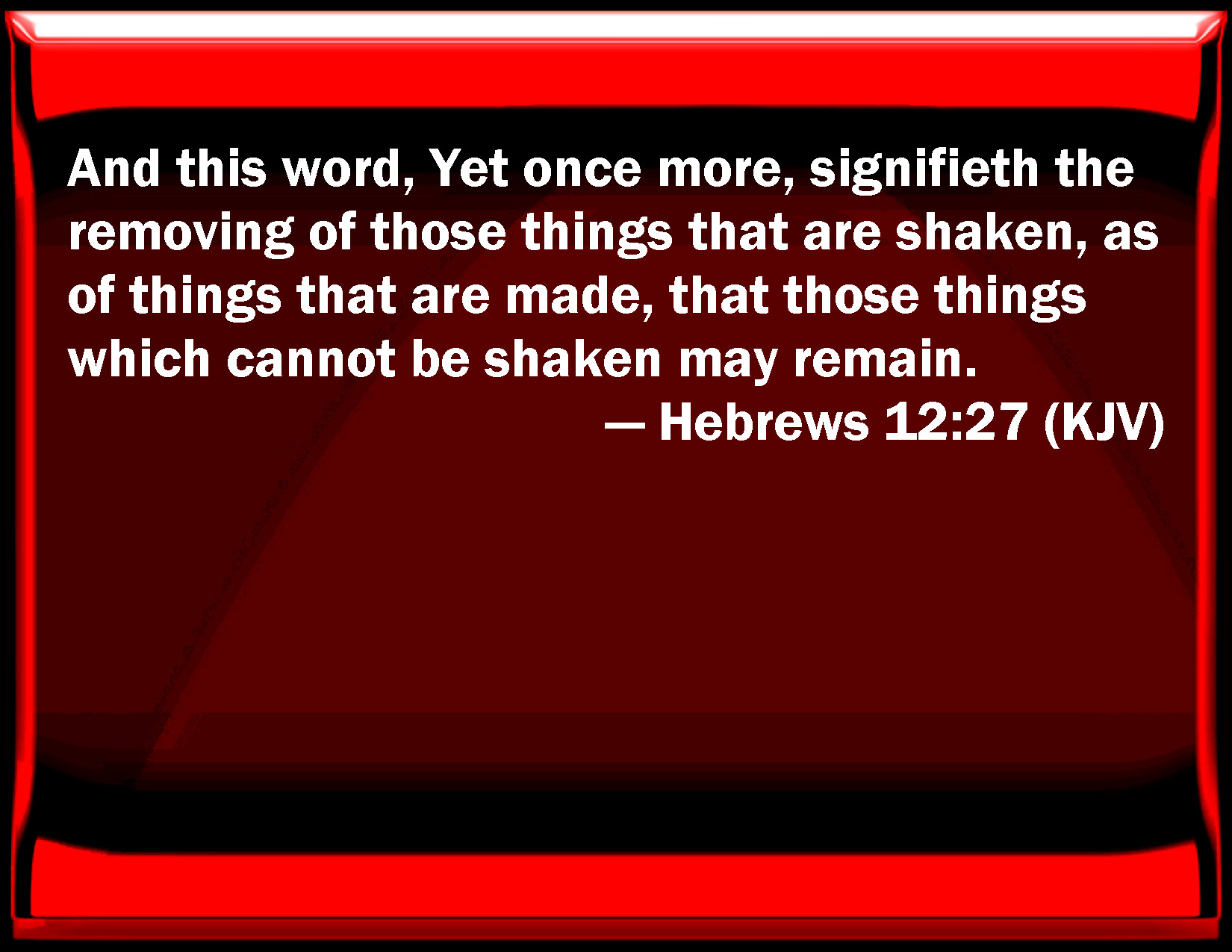 Bible Verse Slide Hebrews 12:27 And this word, Yet once more, signifies the removing of those things that are shaken, as of things that are made, that those things which cannot be shaken may remain. KJV: And this word, Yet once more, signifieth the removing of those things that are shaken, as of things that are made, that those things which cannot be shaken may remain. DRB: And in that he saith, Yet once more, he signifieth the translation of the moveable things as made, that those things may remain which are immoveable. DBT: But this Yet once, signifies the removing of what is shaken, as being made, that what is not shaken may remain. ERV: And this word, Yet once more, signifieth the removing of those things that are shaken, as of things that have been made, that those things which are not shaken may remain. WBT: And this word, Yet once more, signifieth the removing of those things that are shaken, as of things that are made, that those things which cannot be shaken may remain. WEB: This phrase, "Yet once more," signifies the removing of those things that are shaken, as of things that have been made, that those things which are not shaken may remain. YLT: and this — 'Yet once' — doth make evident the removal of the things shaken, as of things having been made, that the things not shaken may remain;Links Hebrews 12:27 NIV • Hebrews 12:27 NLT • Hebrews 12:27 ESV • Hebrews 12:27 NASB • Hebrews 12:27 KJV • Hebrews 12:27 Interlinear • Hebrews 12:27 Commentaries • Hebrews 12:27 Parallel Texts • Hebrews 12:27 Bible Apps • Hebrews 12:27 Parallel • Bible Hub |