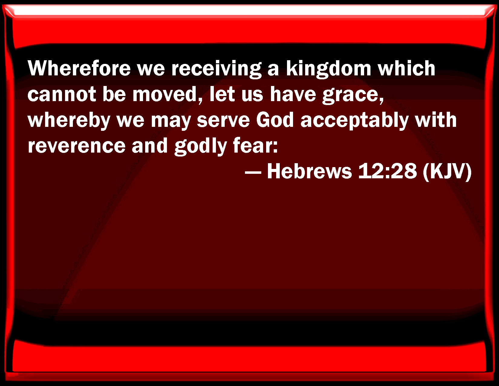 Bible Verse Slide Hebrews 12:28 Why we receiving a kingdom which cannot be moved, let us have grace, whereby we may serve God acceptably with reverence and godly fear: KJV: Wherefore we receiving a kingdom which cannot be moved, let us have grace, whereby we may serve God acceptably with reverence and godly fear: DRB: Therefore receiving an immoveable kingdom, we have grace; whereby let us serve, pleasing God, with fear and reverence. DBT: Wherefore let us, receiving a kingdom not to be shaken, have grace, by which let us serve God acceptably with reverence and fear. ERV: Wherefore, receiving a kingdom that cannot be shaken, let us have grace, whereby we may offer service well-pleasing to God with reverence and awe: WBT: Wherefore we receiving a kingdom which cannot be moved, let us have grace, by which we may serve God acceptably, with reverence and godly fear. WEB: Therefore, receiving a Kingdom that can't be shaken, let us have grace, through which we serve God acceptably, with reverence and awe, YLT: wherefore, a kingdom that cannot be shaken receiving, may we have grace, through which we may serve God well-pleasingly, with reverence and religious fear;Links Hebrews 12:28 NIV • Hebrews 12:28 NLT • Hebrews 12:28 ESV • Hebrews 12:28 NASB • Hebrews 12:28 KJV • Hebrews 12:28 Interlinear • Hebrews 12:28 Commentaries • Hebrews 12:28 Parallel Texts • Hebrews 12:28 Bible Apps • Hebrews 12:28 Parallel • Bible Hub |