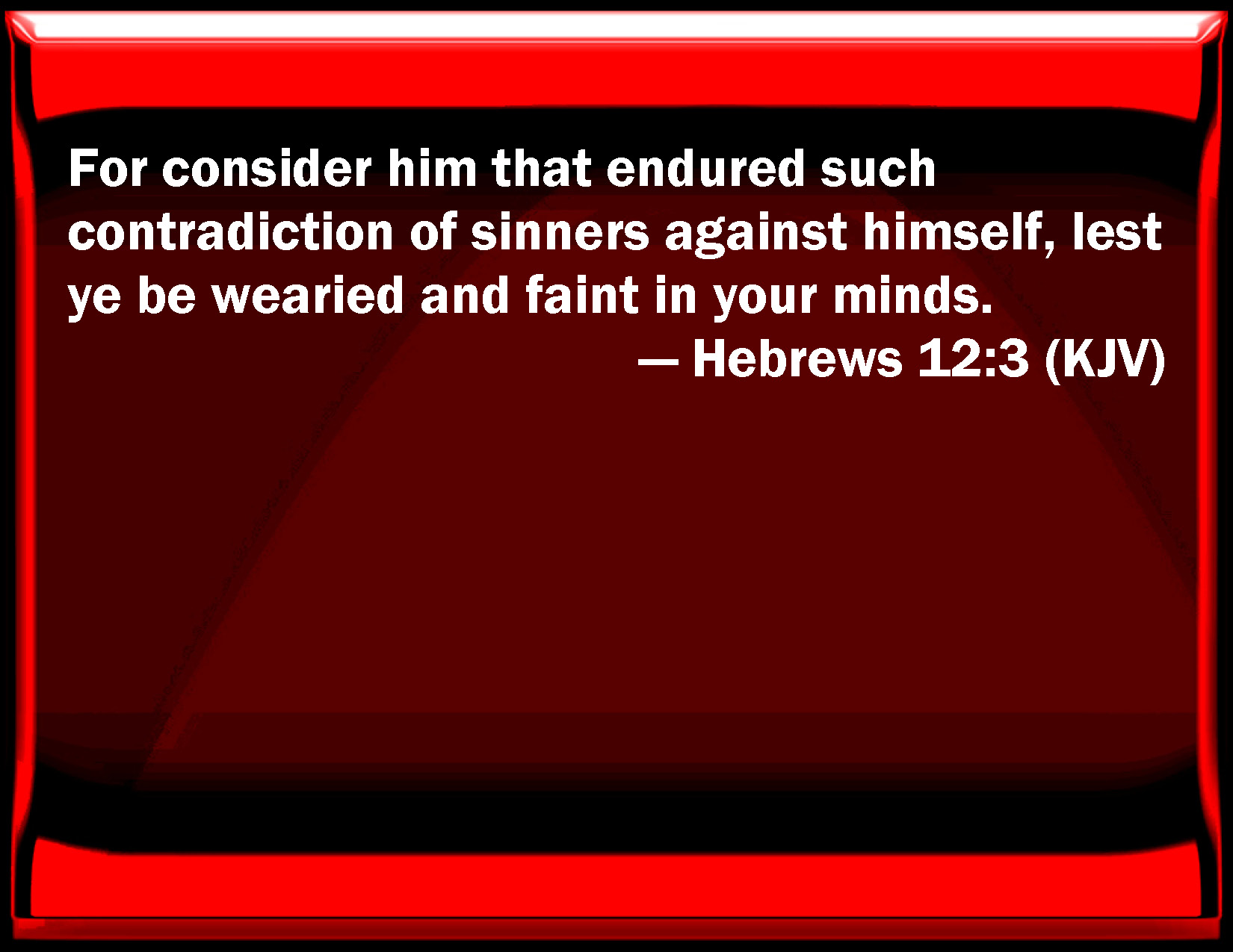 Bible Verse Slide Hebrews 12:3 For consider him that endured such contradiction of sinners against himself, lest you be wearied and faint in your minds. KJV: For consider him that endured such contradiction of sinners against himself, lest ye be wearied and faint in your minds. DRB: For think diligently upon him that endured such opposition from sinners against himself; that you be not wearied, fainting in your minds. DBT: For consider well him who endured so great contradiction from sinners against himself, that ye be not weary, fainting in your minds. ERV: For consider him that hath endured such gainsaying of sinners against themselves, that ye wax not weary, fainting in your souls. WBT: For consider him that endured such contradiction of sinners against himself, lest ye be wearied and faint in your minds. WEB: For consider him who has endured such contradiction of sinners against himself, that you don't grow weary, fainting in your souls. YLT: for consider again him who endured such gainsaying from the sinners to himself, that ye may not be wearied in your souls — being faint.Links Hebrews 12:3 NIV • Hebrews 12:3 NLT • Hebrews 12:3 ESV • Hebrews 12:3 NASB • Hebrews 12:3 KJV • Hebrews 12:3 Interlinear • Hebrews 12:3 Commentaries • Hebrews 12:3 Parallel Texts • Hebrews 12:3 Bible Apps • Hebrews 12:3 Parallel • Bible Hub |