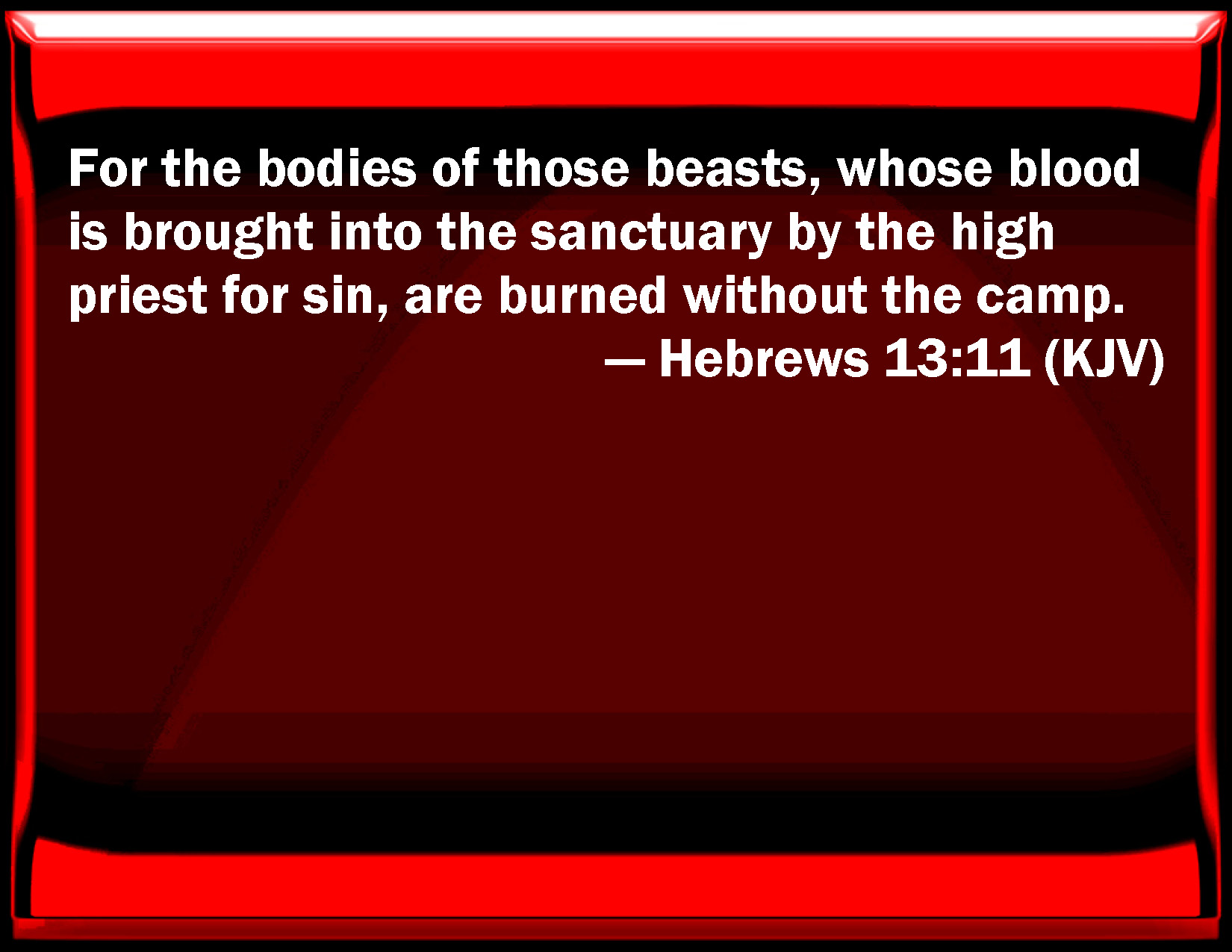 Bible Verse Slide Hebrews 13:11 For the bodies of those beasts, whose blood is brought into the sanctuary by the high priest for sin, are burned without the camp. KJV: For the bodies of those beasts, whose blood is brought into the sanctuary by the high priest for sin, are burned without the camp. DRB: For the bodies of those beasts, whose blood is brought into the holies by the high priest for sin, are burned without the camp. DBT: for of those beasts whose blood is carried as sacrifices for sin into the holy of holies by the high priest, of these the bodies are burned outside the camp. ERV: For the bodies of those beasts, whose blood is brought into the holy place by the high priest as an offering for sin, are burned without the camp. WBT: For the bodies of those beasts, whose blood is brought into the sanctuary by the high priest for sin, are burned without the camp. WEB: For the bodies of those animals, whose blood is brought into the holy place by the high priest as an offering for sin, are burned outside of the camp. YLT: for of those beasts whose blood is brought for sin into the holy places through the chief priest — of these the bodies are burned without the camp.Links Hebrews 13:11 NIV • Hebrews 13:11 NLT • Hebrews 13:11 ESV • Hebrews 13:11 NASB • Hebrews 13:11 KJV • Hebrews 13:11 Interlinear • Hebrews 13:11 Commentaries • Hebrews 13:11 Parallel Texts • Hebrews 13:11 Bible Apps • Hebrews 13:11 Parallel • Bible Hub |