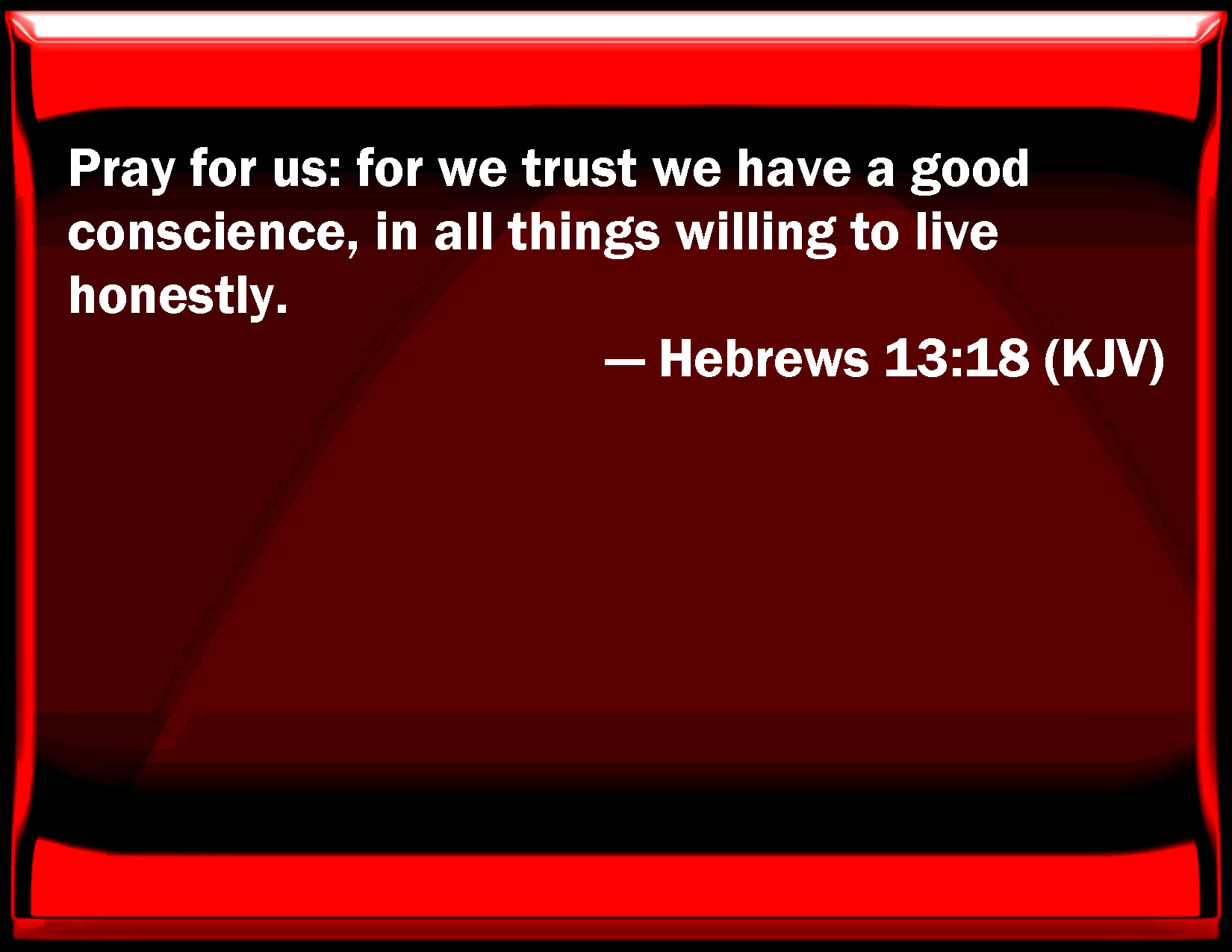 Bible Verse Slide Hebrews 13:18 Pray for us: for we trust we have a good conscience, in all things willing to live honestly. KJV: Pray for us: for we trust we have a good conscience, in all things willing to live honestly. DRB: Pray for us. For we trust we have a good conscience, being willing to behave ourselves well in all things. DBT: Pray for us: for we persuade ourselves that we have a good conscience, in all things desirous to walk rightly. ERV: Pray for us: for we are persuaded that we have a good conscience, desiring to live honestly in all things. WBT: Pray for us: for we trust we have a good conscience, in all things willing to live honestly. WEB: Pray for us, for we are persuaded that we have a good conscience, desiring to live honorably in all things. YLT: Pray for us, for we trust that we have a good conscience, in all things willing to behave well,Links Hebrews 13:18 NIV • Hebrews 13:18 NLT • Hebrews 13:18 ESV • Hebrews 13:18 NASB • Hebrews 13:18 KJV • Hebrews 13:18 Interlinear • Hebrews 13:18 Commentaries • Hebrews 13:18 Parallel Texts • Hebrews 13:18 Bible Apps • Hebrews 13:18 Parallel • Bible Hub |