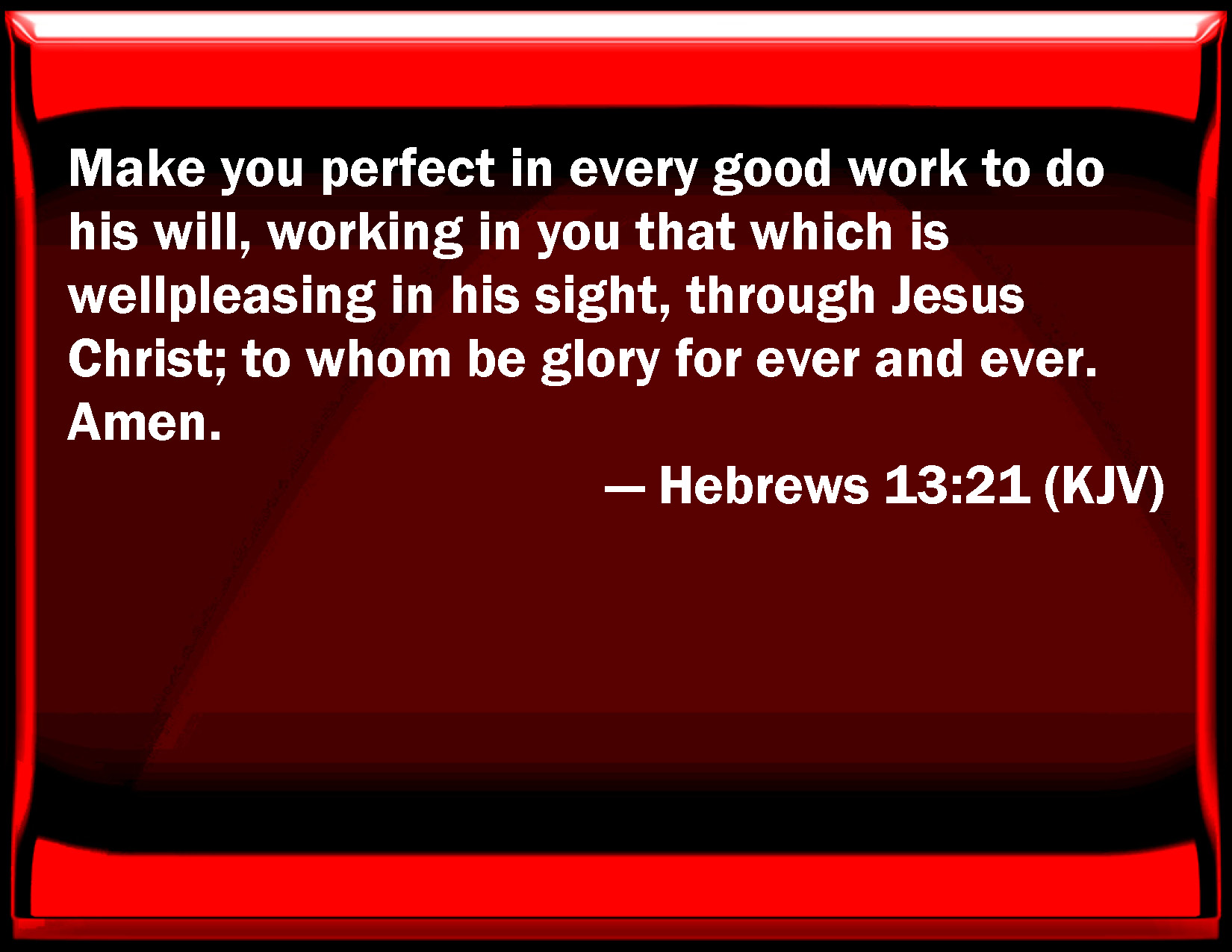 Bible Verse Slide Hebrews 13:21 Make you perfect in every good work to do his will, working in you that which is well pleasing in his sight, through Jesus Christ; to whom be glory for ever and ever. Amen. KJV: Make you perfect in every good work to do his will, working in you that which is wellpleasing in his sight, through Jesus Christ; to whom be glory for ever and ever. Amen. DRB: Fit you in all goodness, that you may do his will; doing in you that which is well pleasing in his sight, through Jesus Christ, to whom is glory for ever and ever. Amen. DBT: perfect you in every good work to the doing of his will, doing in you what is pleasing before him through Jesus Christ; to whom be glory for the ages of ages. Amen. ERV: make you perfect in every good thing to do his will, working in us that which is well-pleasing in his sight, through Jesus Christ; to whom be the glory for ever and ever. Amen. WBT: Make you perfect in every good work to do his will, working in you that which is well-pleasing in his sight, through Jesus Christ; to whom be glory for ever and ever. Amen. WEB: make you complete in every good work to do his will, working in you that which is well pleasing in his sight, through Jesus Christ, to whom be the glory forever and ever. Amen. YLT: make you perfect in every good work to do His will, doing in you that which is well-pleasing before Him, through Jesus Christ, to whom is the glory — to the ages of the ages! Amen.Links Hebrews 13:21 NIV • Hebrews 13:21 NLT • Hebrews 13:21 ESV • Hebrews 13:21 NASB • Hebrews 13:21 KJV • Hebrews 13:21 Interlinear • Hebrews 13:21 Commentaries • Hebrews 13:21 Parallel Texts • Hebrews 13:21 Bible Apps • Hebrews 13:21 Parallel • Bible Hub |