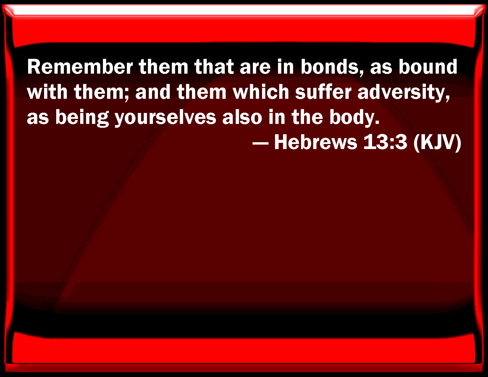Bible Verse Slide Hebrews 13:3 Remember them that are in bonds, as bound with them; and them which suffer adversity, as being yourselves also in the body. KJV: Remember them that are in bonds, as bound with them; and them which suffer adversity, as being yourselves also in the body. DRB: Remember them that are in bands, as if you were bound with them; and them that labour, as being yourselves also in the body. DBT: Remember prisoners, as bound with them; those that are evil-treated, as being yourselves also in the body. ERV: Remember them that are in bonds, as bound with them; them that are evil entreated, as being yourselves also in the body. WBT: Remember them that are in bonds, as bound with them; and them who suffer adversity, as being yourselves also in the body. WEB: Remember those who are in bonds, as bound with them; and those who are ill-treated, since you are also in the body. YLT: be mindful of those in bonds, as having been bound with them, of those maltreated, as also yourselves being in the body;Links Hebrews 13:3 NIV • Hebrews 13:3 NLT • Hebrews 13:3 ESV • Hebrews 13:3 NASB • Hebrews 13:3 KJV • Hebrews 13:3 Interlinear • Hebrews 13:3 Commentaries • Hebrews 13:3 Parallel Texts • Hebrews 13:3 Bible Apps • Hebrews 13:3 Parallel • Bible Hub |