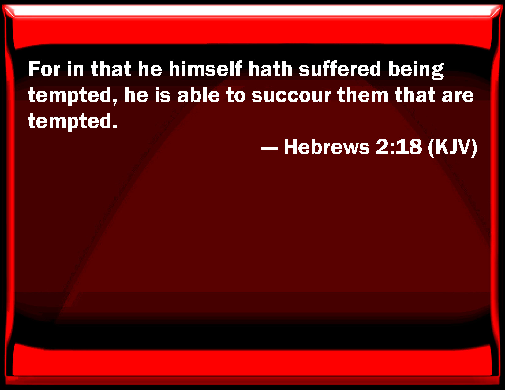 Bible Verse Slide Hebrews 2:18 For in that he himself has suffered being tempted, he is able to succor them that are tempted. KJV: For in that he himself hath suffered being tempted, he is able to succour them that are tempted. DRB: For in that, wherein he himself hath suffered and been tempted, he is able to succour them also that are tempted. DBT: for, in that himself has suffered, being tempted, he is able to help those that are being tempted. ERV: For in that he himself hath suffered being tempted, he is able to succour them that are tempted. WBT: For in that he himself hath suffered, being tempted, he is able to succor them that are tempted. WEB: For in that he himself has suffered being tempted, he is able to help those who are tempted. YLT: for in that he suffered, himself being tempted, he is able to help those who are tempted.Links Hebrews 2:18 NIV • Hebrews 2:18 NLT • Hebrews 2:18 ESV • Hebrews 2:18 NASB • Hebrews 2:18 KJV • Hebrews 2:18 Interlinear • Hebrews 2:18 Commentaries • Hebrews 2:18 Parallel Texts • Hebrews 2:18 Bible Apps • Hebrews 2:18 Parallel • Bible Hub |