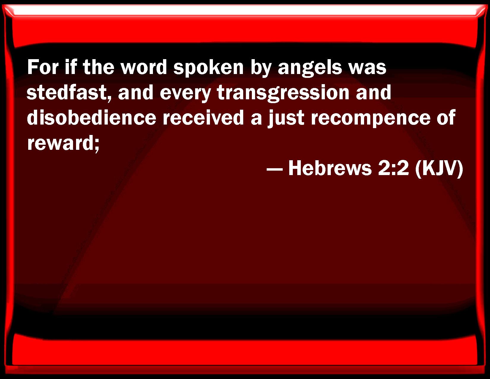 Bible Verse Slide Hebrews 2:2 For if the word spoken by angels was steadfast, and every transgression and disobedience received a just recompense of reward; KJV: For if the word spoken by angels was stedfast, and every transgression and disobedience received a just recompence of reward; DRB: For if the word, spoken by angels, became steadfast, and every transgression and disobedience received a just recompense of reward: DBT: For if the word which was spoken by angels was firm, and every transgression and disobedience received just retribution, ERV: For if the word spoken through angels proved stedfast, and every transgression and disobedience received a just recompense of reward; WBT: For if the word spoken by angels was steadfast, and every transgression and disobedience received a just recompense of reward; WEB: For if the word spoken through angels proved steadfast, and every transgression and disobedience received a just recompense; YLT: for if the word being spoken through messengers did become stedfast, and every transgression and disobedience did receive a just recompense,Links Hebrews 2:2 NIV • Hebrews 2:2 NLT • Hebrews 2:2 ESV • Hebrews 2:2 NASB • Hebrews 2:2 KJV • Hebrews 2:2 Interlinear • Hebrews 2:2 Commentaries • Hebrews 2:2 Parallel Texts • Hebrews 2:2 Bible Apps • Hebrews 2:2 Parallel • Bible Hub |