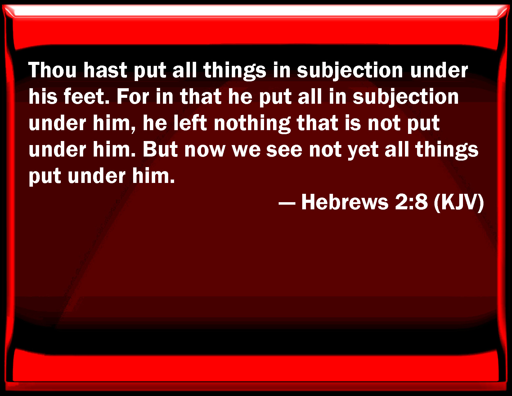 Bible Verse Slide Hebrews 2:8 You have put all things in subjection under his feet. For in that he put all in subjection under him, he left nothing that is not put under him. But now we see not yet all things put under him. KJV: Thou hast put all things in subjection under his feet. For in that he put all in subjection under him, he left nothing that is not put under him. But now we see not yet all things put under him. DRB: Thou hast subjected all things under his feet. For in that he hath subjected all things to him, he left nothing not subject to him. But now we see not as yet all things subject to him. DBT: thou hast subjected all things under his feet. For in subjecting all things to him, he has left nothing unsubject to him. But now we see not yet all things subjected to him, ERV: Thou didst put all things in subjection under his feet. For in that he subjected all things unto him, he left nothing that is not subject to him. But now we see not yet all things subjected to him. WBT: Thou hast put all things in subjection under his feet. For in that he put all in subjection under him, he left nothing that is not made subject to him. But now we see not yet all things subjected to him. WEB: You have put all things in subjection under his feet." For in that he subjected all things to him, he left nothing that is not subject to him. But now we don't see all things subjected to him, yet. YLT: all things Thou didst put in subjection under his feet,' for in the subjecting to him the all things, nothing did He leave to him unsubjected, and now not yet do we see the all things subjected to him,Links Hebrews 2:8 NIV • Hebrews 2:8 NLT • Hebrews 2:8 ESV • Hebrews 2:8 NASB • Hebrews 2:8 KJV • Hebrews 2:8 Interlinear • Hebrews 2:8 Commentaries • Hebrews 2:8 Parallel Texts • Hebrews 2:8 Bible Apps • Hebrews 2:8 Parallel • Bible Hub |