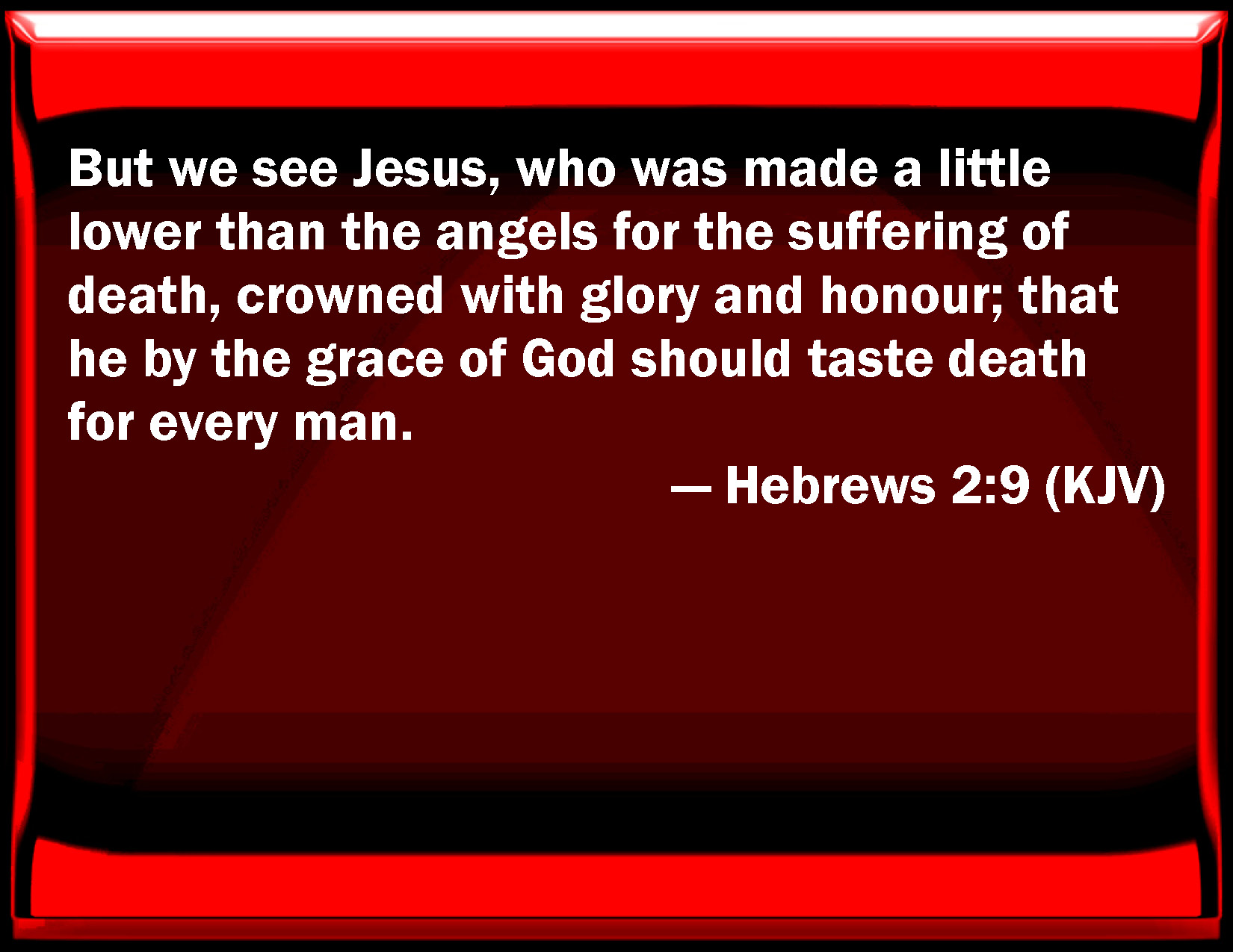 Bible Verse Slide Hebrews 2:9 But we see Jesus, who was made a little lower than the angels for the suffering of death, crowned with glory and honor; that he by the grace of God should taste death for every man. KJV: But we see Jesus, who was made a little lower than the angels for the suffering of death, crowned with glory and honour; that he by the grace of God should taste death for every man. DRB: But we see Jesus, who was made a little lower than the angels, for the suffering of death, crowned with glory and honour: that, through the grace of God, he might taste death for all. DBT: but we see Jesus, who was made some little inferior to angels on account of the suffering of death, crowned with glory and honour; so that by the grace of God he should taste death for every thing. ERV: But we behold him who hath been made a little lower than the angels, even Jesus, because of the suffering of death crowned with glory and honour, that by the grace of God he should taste death for every man. WBT: But we see Jesus, who was made a little lower than the angels for the suffering of death, crowned with glory and honor; that he by the grace of God should taste death for every man. WEB: But we see him who has been made a little lower than the angels, Jesus, because of the suffering of death crowned with glory and honor, that by the grace of God he should taste of death for everyone. YLT: and him who was made some little less than messengers we see — Jesus — because of the suffering of the death, with glory and honour having been crowned, that by the grace of God for every one he might taste of death.Links Hebrews 2:9 NIV • Hebrews 2:9 NLT • Hebrews 2:9 ESV • Hebrews 2:9 NASB • Hebrews 2:9 KJV • Hebrews 2:9 Interlinear • Hebrews 2:9 Commentaries • Hebrews 2:9 Parallel Texts • Hebrews 2:9 Bible Apps • Hebrews 2:9 Parallel • Bible Hub |