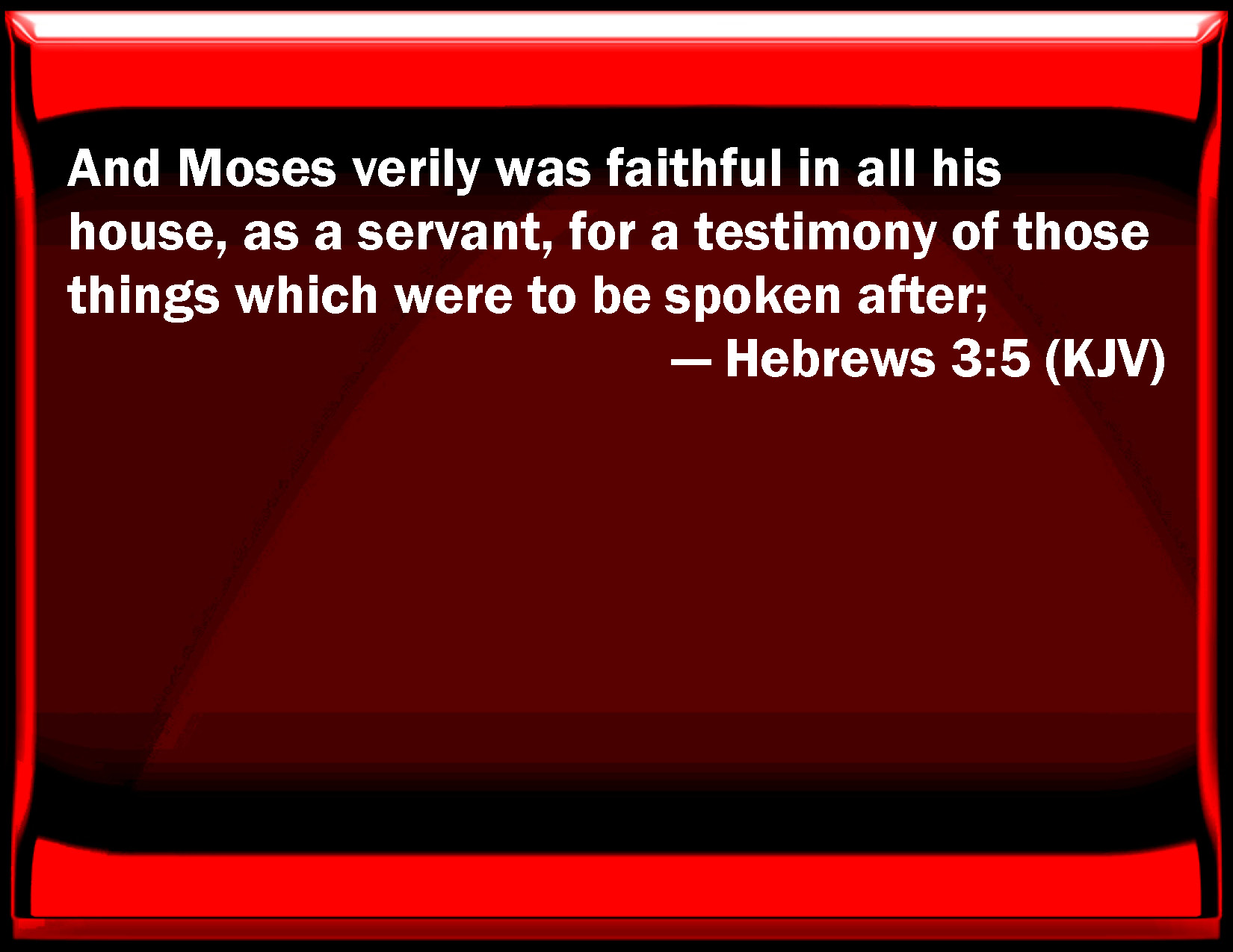 Bible Verse Slide Hebrews 3:5 And Moses truly was faithful in all his house, as a servant, for a testimony of those things which were to be spoken after; KJV: And Moses verily was faithful in all his house, as a servant, for a testimony of those things which were to be spoken after; DRB: And Moses indeed was faithful in all his house as a servant, for a testimony of those things which were to be said: DBT: And Moses indeed was faithful in all his house, as a ministering servant, for a testimony of the things to be spoken after; ERV: And Moses indeed was faithful in all his house as a servant, for a testimony of those things which were afterward to be spoken; WBT: And Moses verily was faithful in all his house, as a servant, for a testimony of those things which were afterwards to be spoken. WEB: Moses indeed was faithful in all his house as a servant, for a testimony of those things which were afterward to be spoken, YLT: and Moses indeed was stedfast in all his house, as an attendant, for a testimony of those things that were to be spoken,Links Hebrews 3:5 NIV • Hebrews 3:5 NLT • Hebrews 3:5 ESV • Hebrews 3:5 NASB • Hebrews 3:5 KJV • Hebrews 3:5 Interlinear • Hebrews 3:5 Commentaries • Hebrews 3:5 Parallel Texts • Hebrews 3:5 Bible Apps • Hebrews 3:5 Parallel • Bible Hub |