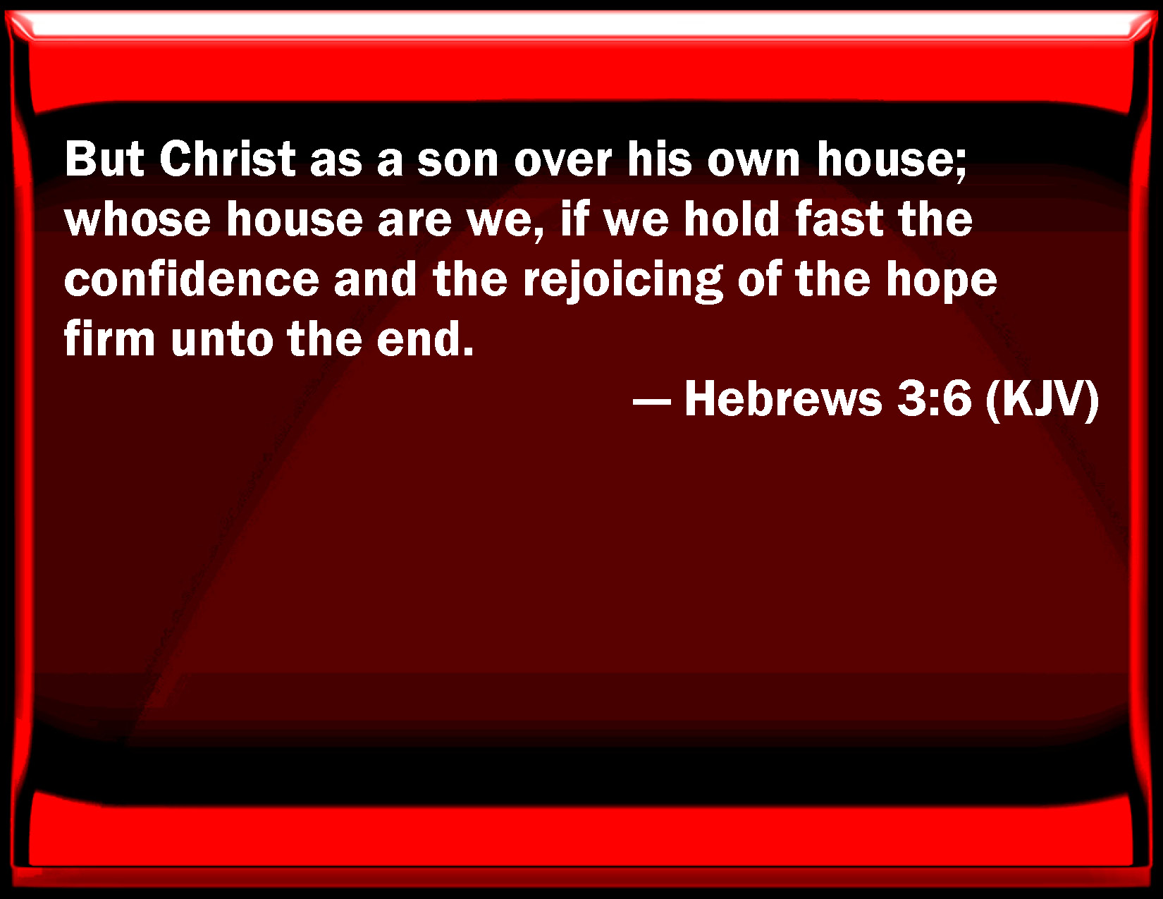 Bible Verse Slide Hebrews 3:6 But Christ as a son over his own house; whose house are we, if we hold fast the confidence and the rejoicing of the hope firm to the end. KJV: But Christ as a son over his own house; whose house are we, if we hold fast the confidence and the rejoicing of the hope firm unto the end. DRB: But Christ as the Son in his own house: which house are we, if we hold fast the confidence and glory of hope unto the end. DBT: but Christ, as Son over his house, whose house are we, if indeed we hold fast the boldness and the boast of hope firm to the end. ERV: but Christ as a son, over his house; whose house are we, if we hold fast our boldness and the glorying of our hope firm unto the end. WBT: But Christ as a son over his own house: whose house are we, if we hold fast the confidence, and the rejoicing of the hope firm to the end. WEB: but Christ is faithful as a Son over his house; whose house we are, if we hold fast our confidence and the glorying of our hope firm to the end. YLT: and Christ, as a Son over his house, whose house are we, if the boldness and the rejoicing of the hope unto the end we hold fast.Links Hebrews 3:6 NIV • Hebrews 3:6 NLT • Hebrews 3:6 ESV • Hebrews 3:6 NASB • Hebrews 3:6 KJV • Hebrews 3:6 Interlinear • Hebrews 3:6 Commentaries • Hebrews 3:6 Parallel Texts • Hebrews 3:6 Bible Apps • Hebrews 3:6 Parallel • Bible Hub |