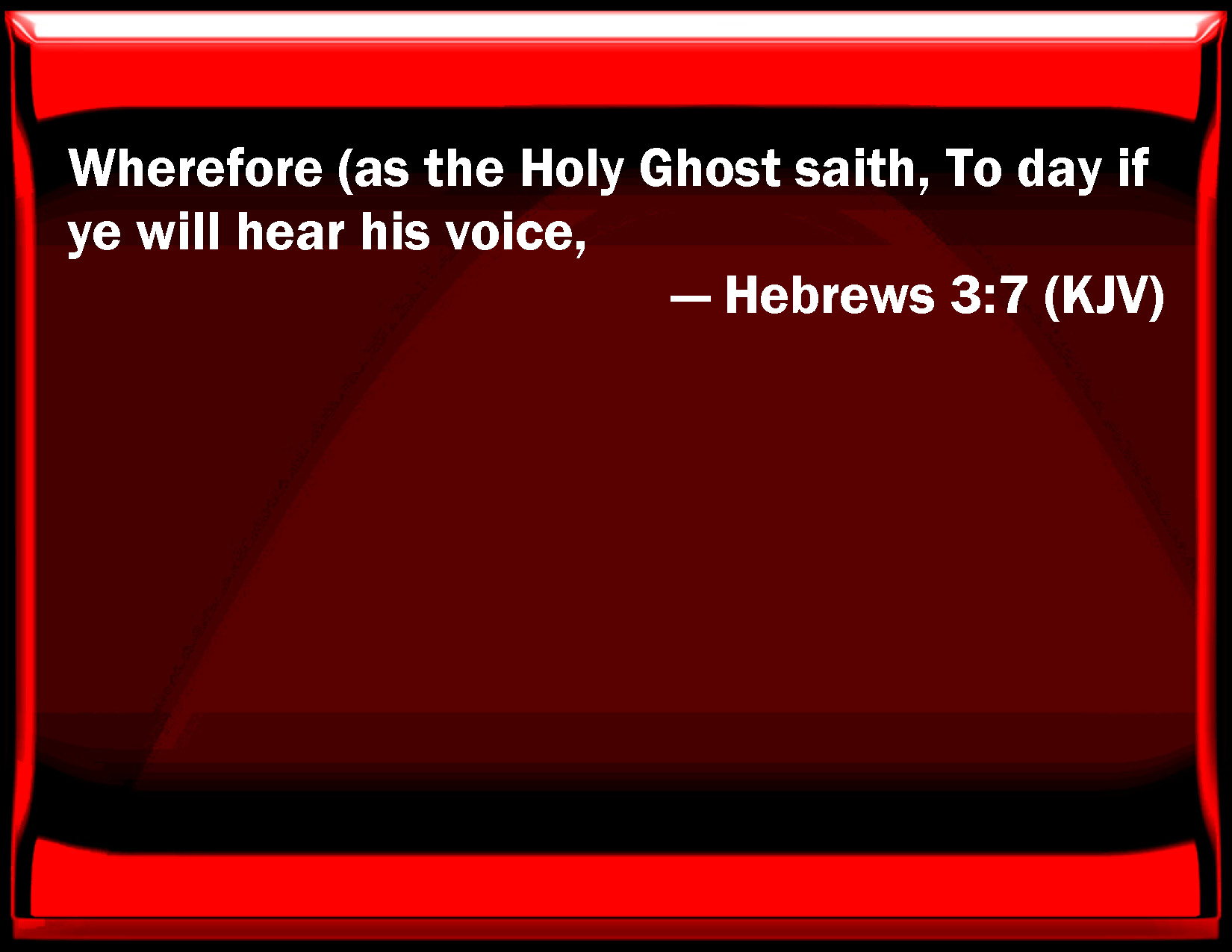 Bible Verse Slide Hebrews 3:7 Why (as the Holy Ghost said, To day if you will hear his voice, KJV: Wherefore (as the Holy Ghost saith, To day if ye will hear his voice, DRB: Wherefore, as the Holy Ghost saith: To day if you shall hear his voice, DBT: Wherefore, even as says the Holy Spirit, To-day if ye will hear his voice, ERV: Wherefore, even as the Holy Ghost saith, Today if ye shall hear his voice, WBT: Wherefore (as the Holy Spirit saith, To-day if ye will hear his voice, WEB: Therefore, even as the Holy Spirit says, "Today if you will hear his voice, YLT: Wherefore, (as the Holy Spirit saith, 'To-day, if His voice ye may hear — Links Hebrews 3:7 NIV • Hebrews 3:7 NLT • Hebrews 3:7 ESV • Hebrews 3:7 NASB • Hebrews 3:7 KJV • Hebrews 3:7 Interlinear • Hebrews 3:7 Commentaries • Hebrews 3:7 Parallel Texts • Hebrews 3:7 Bible Apps • Hebrews 3:7 Parallel • Bible Hub |