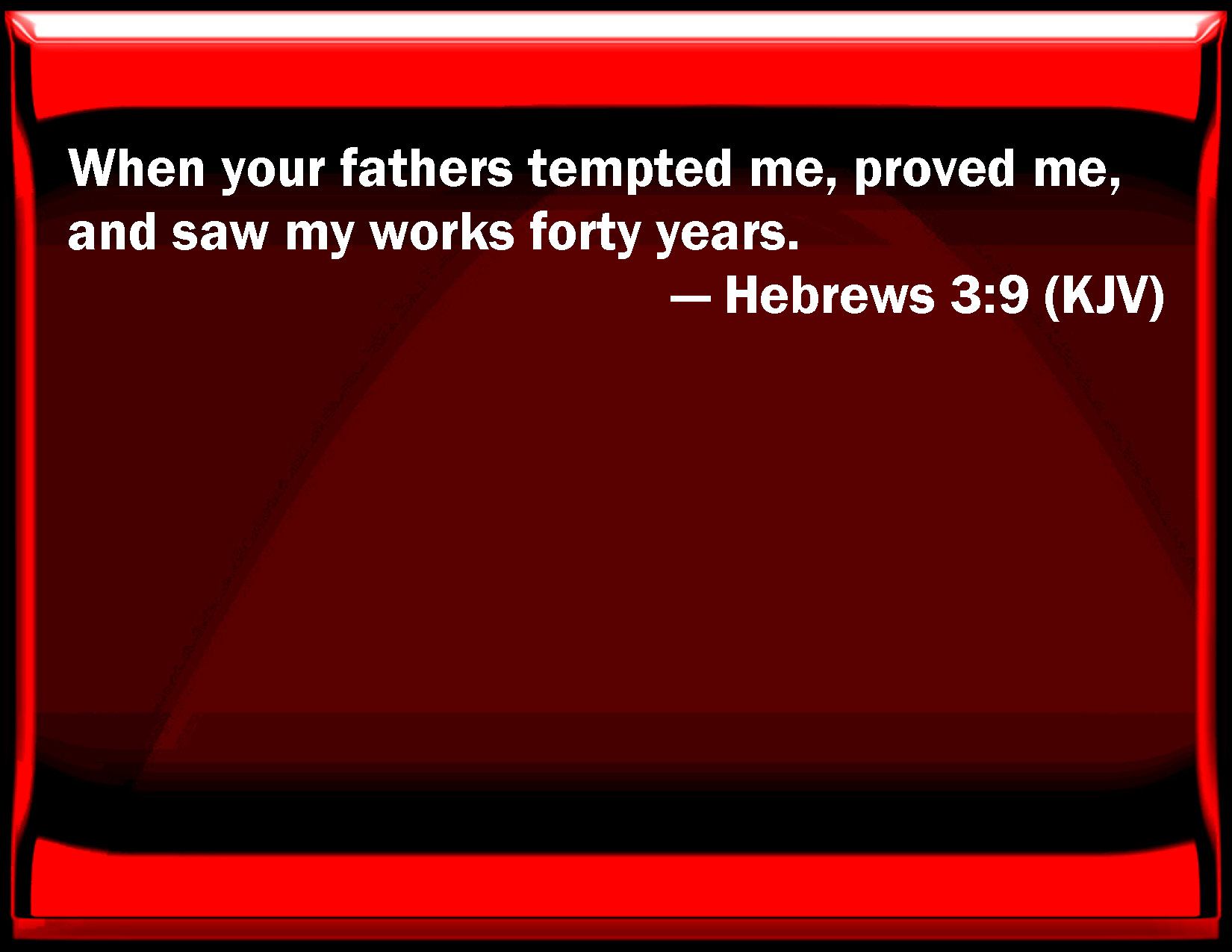 Bible Verse Slide Hebrews 3:9 When your fathers tempted me, proved me, and saw my works forty years. KJV: When your fathers tempted me, proved me, and saw my works forty years. DRB: Where your fathers tempted me, proved and saw my works, DBT: where your fathers tempted me, by proving me, and saw my works forty years. ERV: Wherewith your fathers tempted me by proving me, And saw my works forty years. WBT: When your fathers tempted me, proved me, and saw my works forty years. WEB: where your fathers tested me by proving me, and saw my works for forty years. YLT: in which tempt Me did your fathers, they did prove Me, and saw My works forty years;Links Hebrews 3:9 NIV • Hebrews 3:9 NLT • Hebrews 3:9 ESV • Hebrews 3:9 NASB • Hebrews 3:9 KJV • Hebrews 3:9 Interlinear • Hebrews 3:9 Commentaries • Hebrews 3:9 Parallel Texts • Hebrews 3:9 Bible Apps • Hebrews 3:9 Parallel • Bible Hub |