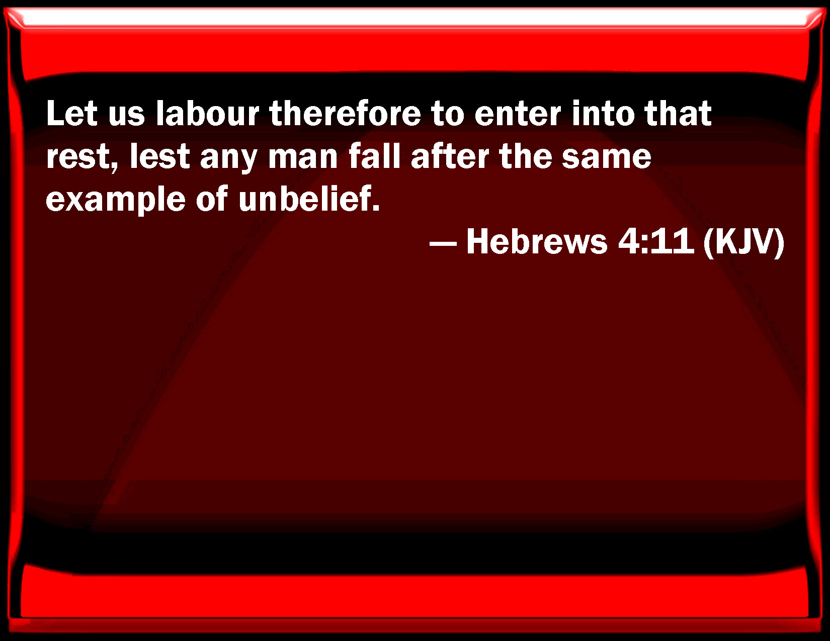 Bible Verse Slide Hebrews 4:11 Let us labor therefore to enter into that rest, lest any man fall after the same example of unbelief. KJV: Let us labour therefore to enter into that rest, lest any man fall after the same example of unbelief. DRB: Let us hasten therefore to enter into that rest; lest any man fall into the same example of unbelief. DBT: Let us therefore use diligence to enter into that rest, that no one may fall after the same example of not hearkening to the word. ERV: Let us therefore give diligence to enter into that rest, that no man fall after the same example of disobedience. WBT: Let us labor therefore to enter into that rest, lest any man fall after the same example of unbelief. WEB: Let us therefore give diligence to enter into that rest, lest anyone fall after the same example of disobedience. YLT: May we be diligent, then, to enter into that rest, that no one in the same example of the unbelief may fall,Links Hebrews 4:11 NIV • Hebrews 4:11 NLT • Hebrews 4:11 ESV • Hebrews 4:11 NASB • Hebrews 4:11 KJV • Hebrews 4:11 Interlinear • Hebrews 4:11 Commentaries • Hebrews 4:11 Parallel Texts • Hebrews 4:11 Bible Apps • Hebrews 4:11 Parallel • Bible Hub |
