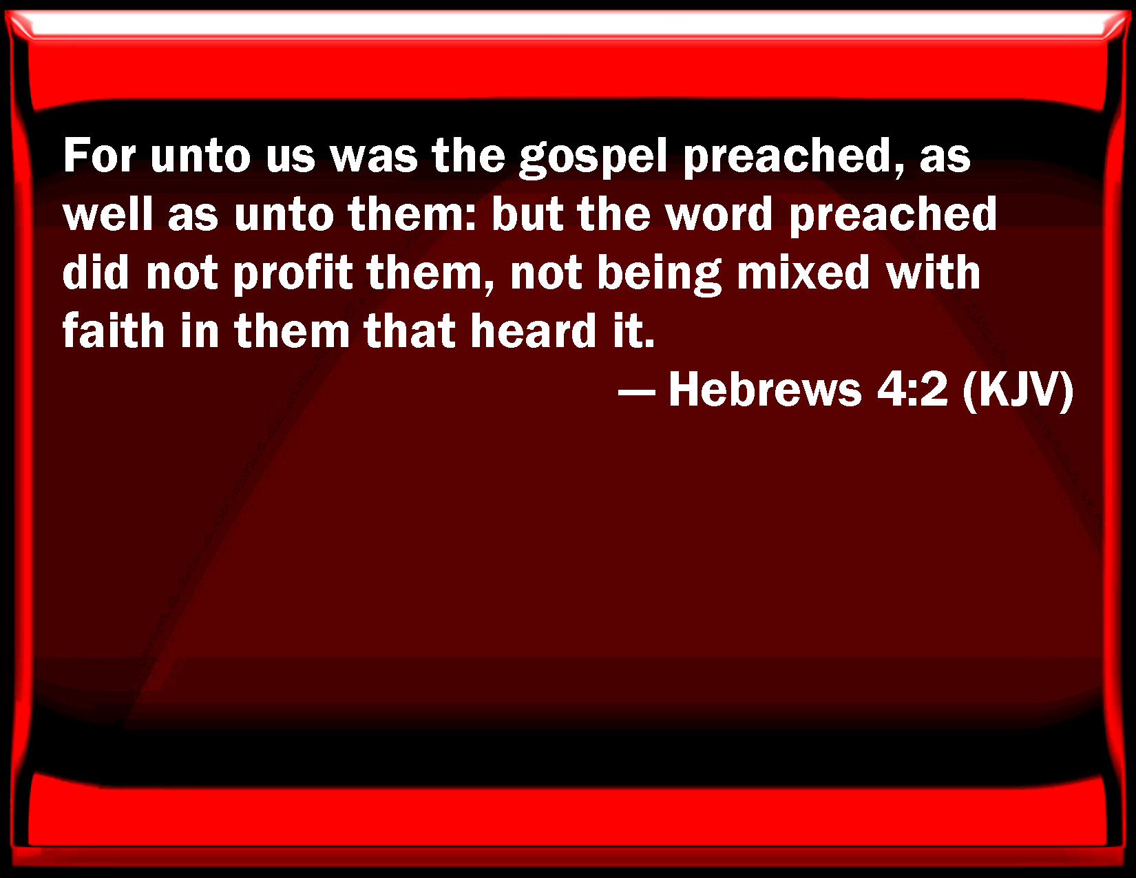 Bible Verse Slide Hebrews 4:2 For to us was the gospel preached, as well as to them: but the word preached did not profit them, not being mixed with faith in them that heard it. KJV: For unto us was the gospel preached, as well as unto them: but the word preached did not profit them, not being mixed with faith in them that heard it. DRB: For unto us also it hath been declared, in like manner as unto them. But the word of hearing did not profit them, not being mixed with faith of those things they heard. DBT: For indeed we have had glad tidings presented to us, even as they also; but the word of the report did not profit them, not being mixed with faith in those who heard. ERV: For indeed we have had good tidings preached unto us, even as also they: but the word of hearing did not profit them, because they were not united by faith with them that heard. WBT: For to us was the gospel preached, as well as to them: but the word which they heard did not profit them, not being mixed with faith in them that heard it. WEB: For indeed we have had good news preached to us, even as they also did, but the word they heard didn't profit them, because it wasn't mixed with faith by those who heard. YLT: for we also are having good news proclaimed, even as they, but the word heard did not profit them, not being mixed with faith in those who heard,Links Hebrews 4:2 NIV • Hebrews 4:2 NLT • Hebrews 4:2 ESV • Hebrews 4:2 NASB • Hebrews 4:2 KJV • Hebrews 4:2 Interlinear • Hebrews 4:2 Commentaries • Hebrews 4:2 Parallel Texts • Hebrews 4:2 Bible Apps • Hebrews 4:2 Parallel • Bible Hub |
