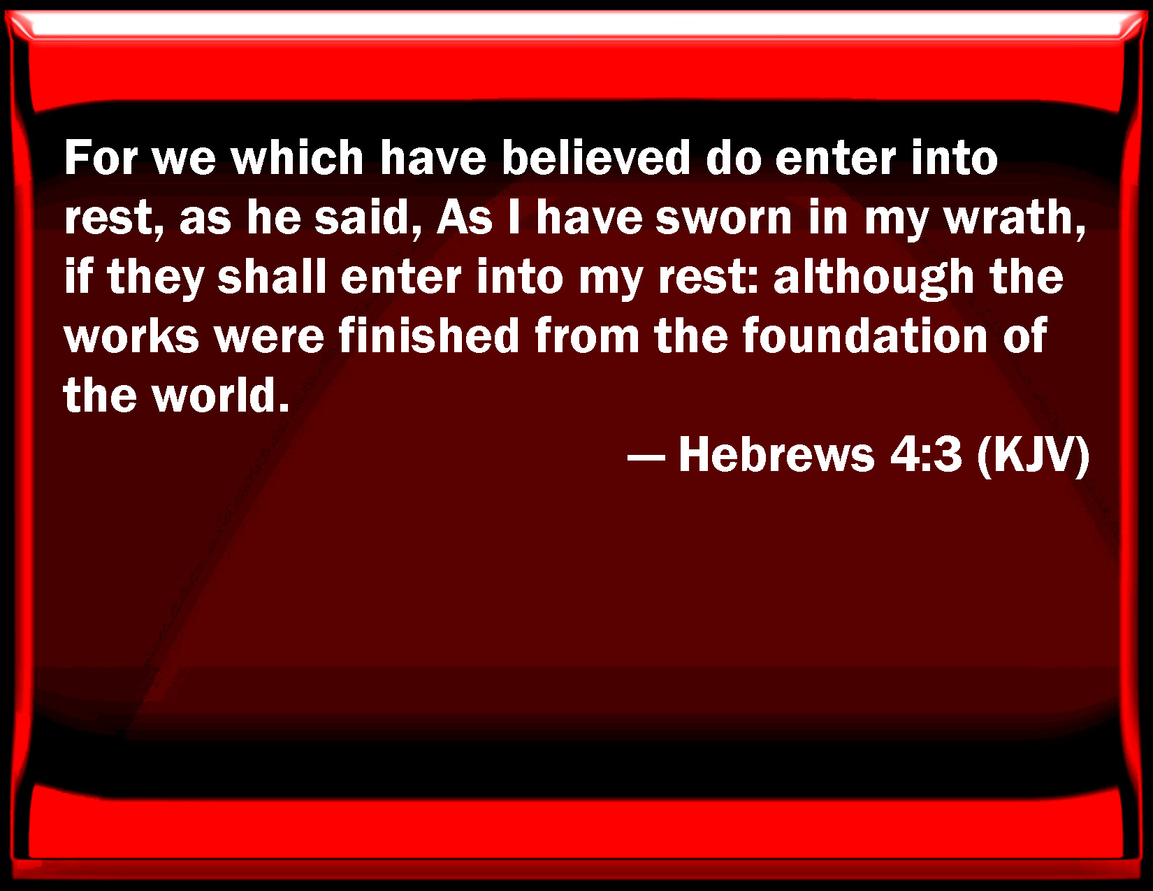 Bible Verse Slide Hebrews 4:3 For we which have believed do enter into rest, as he said, As I have sworn in my wrath, if they shall enter into my rest: although the works were finished from the foundation of the world. KJV: For we which have believed do enter into rest, as he said, As I have sworn in my wrath, if they shall enter into my rest: although the works were finished from the foundation of the world. DRB: For we, who have believed, shall enter into rest; as he said: As I have sworn in my wrath; If they shall enter into my rest; and this indeed when the works from the foundation of the world were finished. DBT: For we enter into the rest who have believed; as he said, As I have sworn in my wrath, If they shall enter into my rest; although the works had been completed from the foundation of the world. ERV: For we which have believed do enter into that rest; even as he hath said, As I sware in my wrath, They shall not enter into my rest: although the works were finished from the foundation of the world. WBT: For we who have believed do enter into rest, as he said, As I have sworn in my wrath, if they shall enter into my rest: although the works were finished from the foundation of the world. WEB: For we who have believed do enter into that rest, even as he has said, "As I swore in my wrath, they will not enter into my rest;" although the works were finished from the foundation of the world. YLT: for we do enter into the rest — we who did believe, as He said, 'So I sware in My anger, If they shall enter into My rest — ;' and yet the works were done from the foundation of the world,Links Hebrews 4:3 NIV • Hebrews 4:3 NLT • Hebrews 4:3 ESV • Hebrews 4:3 NASB • Hebrews 4:3 KJV • Hebrews 4:3 Interlinear • Hebrews 4:3 Commentaries • Hebrews 4:3 Parallel Texts • Hebrews 4:3 Bible Apps • Hebrews 4:3 Parallel • Bible Hub |