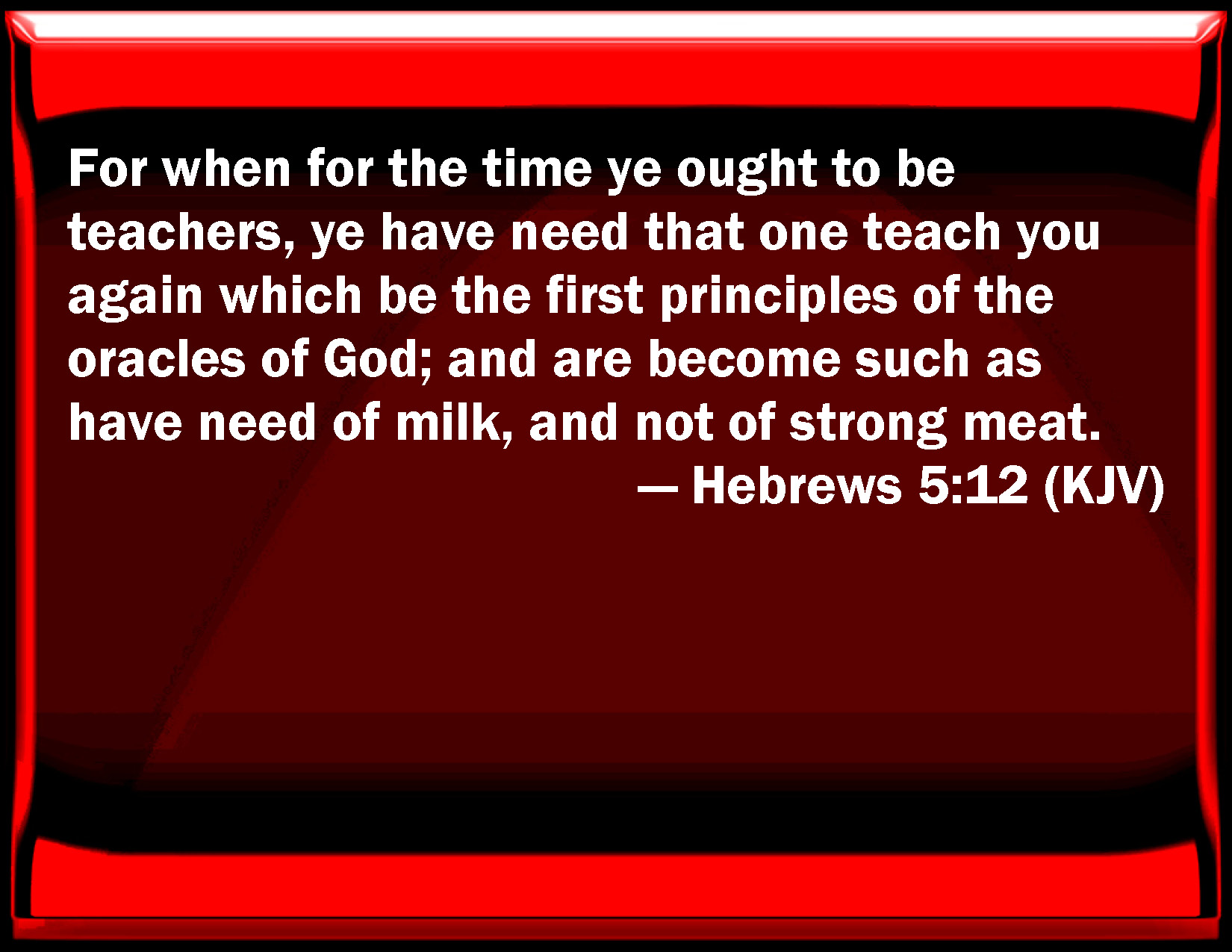 Bible Verse Slide Hebrews 5:12 For when for the time you ought to be teachers, you have need that one teach you again which be the first principles of the oracles of God; and are become such as have need of milk, and not of strong meat. KJV: For when for the time ye ought to be teachers, ye have need that one teach you again which be the first principles of the oracles of God; and are become such as have need of milk, and not of strong meat. DRB: For whereas for the time you ought to be masters, you have need to be taught again what are the first elements of the words of God: and you are become such as have need of milk, and not of strong meat. DBT: For when for the time ye ought to be teachers, ye have again need that one should teach you what are the elements of the beginning of the oracles of God, and are become such as have need of milk, and not of solid food. ERV: For when by reason of the time ye ought to be teachers, ye have need again that some one teach you the rudiments of the first principles of the oracles of God; and are become such as have need of milk, and not of solid food. WBT: For when for the time ye ought to be teachers, ye have need of one to teach you again which are the first principles of the oracles of God; and are become such as have need of milk, and not of strong food. WEB: For although by this time you should be teachers, you again need to have someone teach you the rudiments of the first principles of the oracles of God. You have come to need milk, and not solid food. YLT: for even owing to be teachers, because of the time, again ye have need that one teach you what are the elements of the beginning of the oracles of God, and ye have become having need of milk, and not of strong food,Links Hebrews 5:12 NIV • Hebrews 5:12 NLT • Hebrews 5:12 ESV • Hebrews 5:12 NASB • Hebrews 5:12 KJV • Hebrews 5:12 Interlinear • Hebrews 5:12 Commentaries • Hebrews 5:12 Parallel Texts • Hebrews 5:12 Bible Apps • Hebrews 5:12 Parallel • Bible Hub |