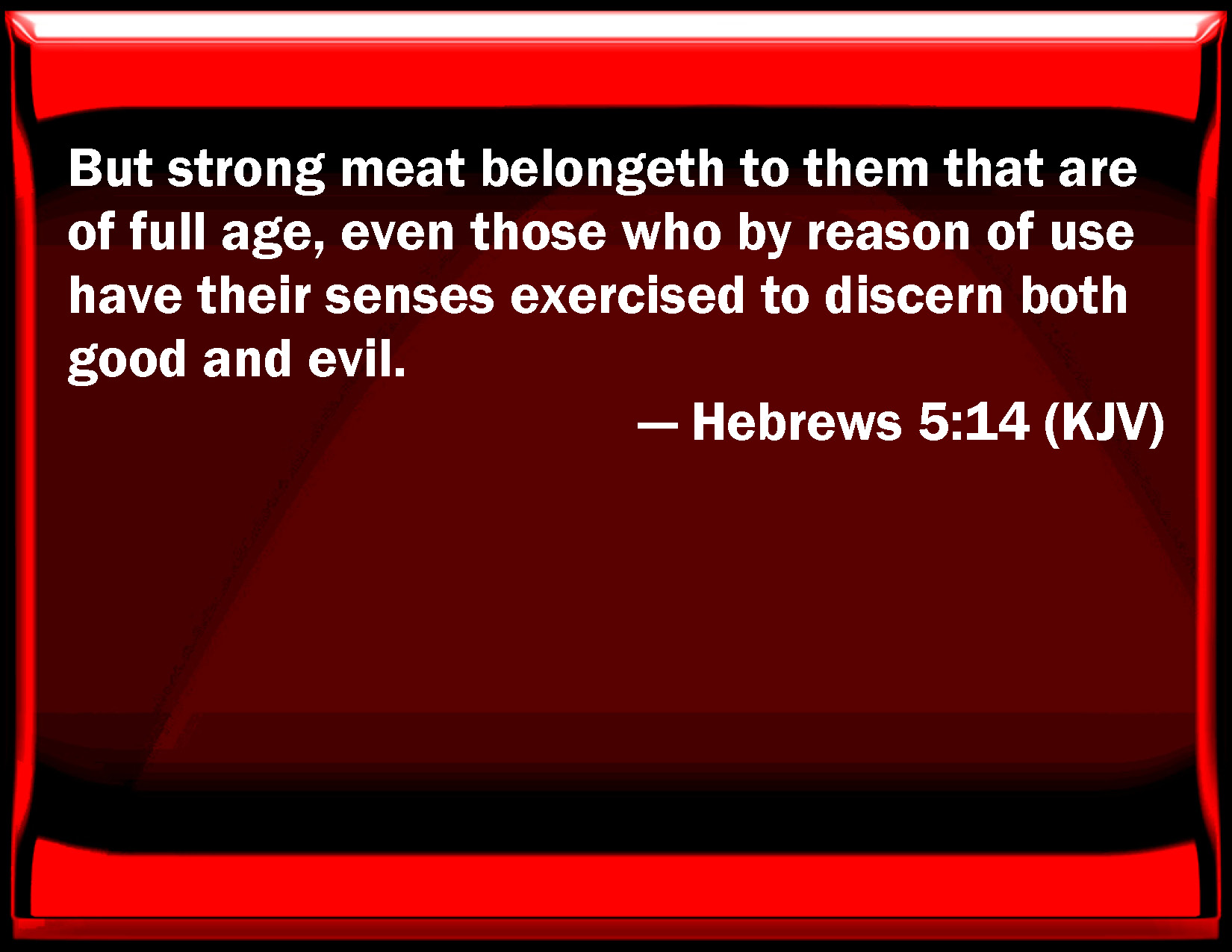 Bible Verse Slide Hebrews 5:14 But strong meat belongs to them that are of full age, even those who by reason of use have their senses exercised to discern both good and evil. KJV: But strong meat belongeth to them that are of full age, even those who by reason of use have their senses exercised to discern both good and evil. DRB: But strong meat is for the perfect; for them who by custom have their senses exercised to the discerning of good and evil. DBT: but solid food belongs to full-grown men, who, on account of habit, have their senses exercised for distinguishing both good and evil. ERV: But solid food is for fullgrown men, even those who by reason of use have their senses exercised to discern good and evil. WBT: But strong food belongeth to them that are of full age, even those who by reason of use have their senses exercised to discern both good and evil. WEB: But solid food is for those who are full grown, who by reason of use have their senses exercised to discern good and evil. YLT: and of perfect men is the strong food, who because of the use are having the senses exercised, unto the discernment both of good and of evil.Links Hebrews 5:14 NIV • Hebrews 5:14 NLT • Hebrews 5:14 ESV • Hebrews 5:14 NASB • Hebrews 5:14 KJV • Hebrews 5:14 Interlinear • Hebrews 5:14 Commentaries • Hebrews 5:14 Parallel Texts • Hebrews 5:14 Bible Apps • Hebrews 5:14 Parallel • Bible Hub |