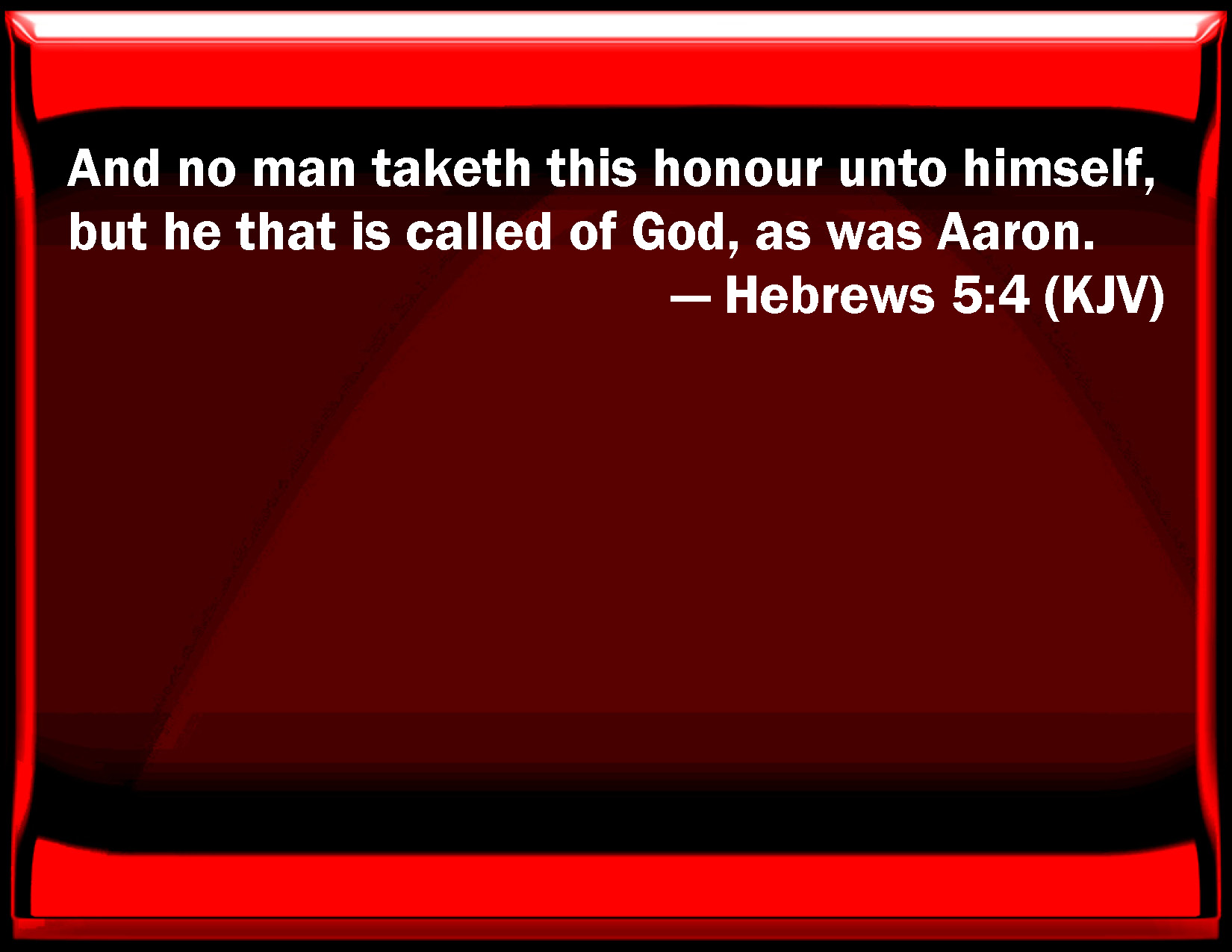 Bible Verse Slide Hebrews 5:4 And no man takes this honor to himself, but he that is called of God, as was Aaron. KJV: And no man taketh this honour unto himself, but he that is called of God, as was Aaron. DRB: Neither doth any man take the honour to himself, but he that is called by God, as Aaron was. DBT: And no one takes the honour to himself but as called by God, even as Aaron also. ERV: And no man taketh the honour unto himself, but when he is called of God, even as was Aaron. WBT: And no man taketh this honor to himself, but he that is called by God, as was Aaron: WEB: Nobody takes this honor on himself, but he is called by God, just like Aaron was. YLT: and no one to himself doth take the honour, but he who is called by God, as also Aaron:Links Hebrews 5:4 NIV • Hebrews 5:4 NLT • Hebrews 5:4 ESV • Hebrews 5:4 NASB • Hebrews 5:4 KJV • Hebrews 5:4 Interlinear • Hebrews 5:4 Commentaries • Hebrews 5:4 Parallel Texts • Hebrews 5:4 Bible Apps • Hebrews 5:4 Parallel • Bible Hub |