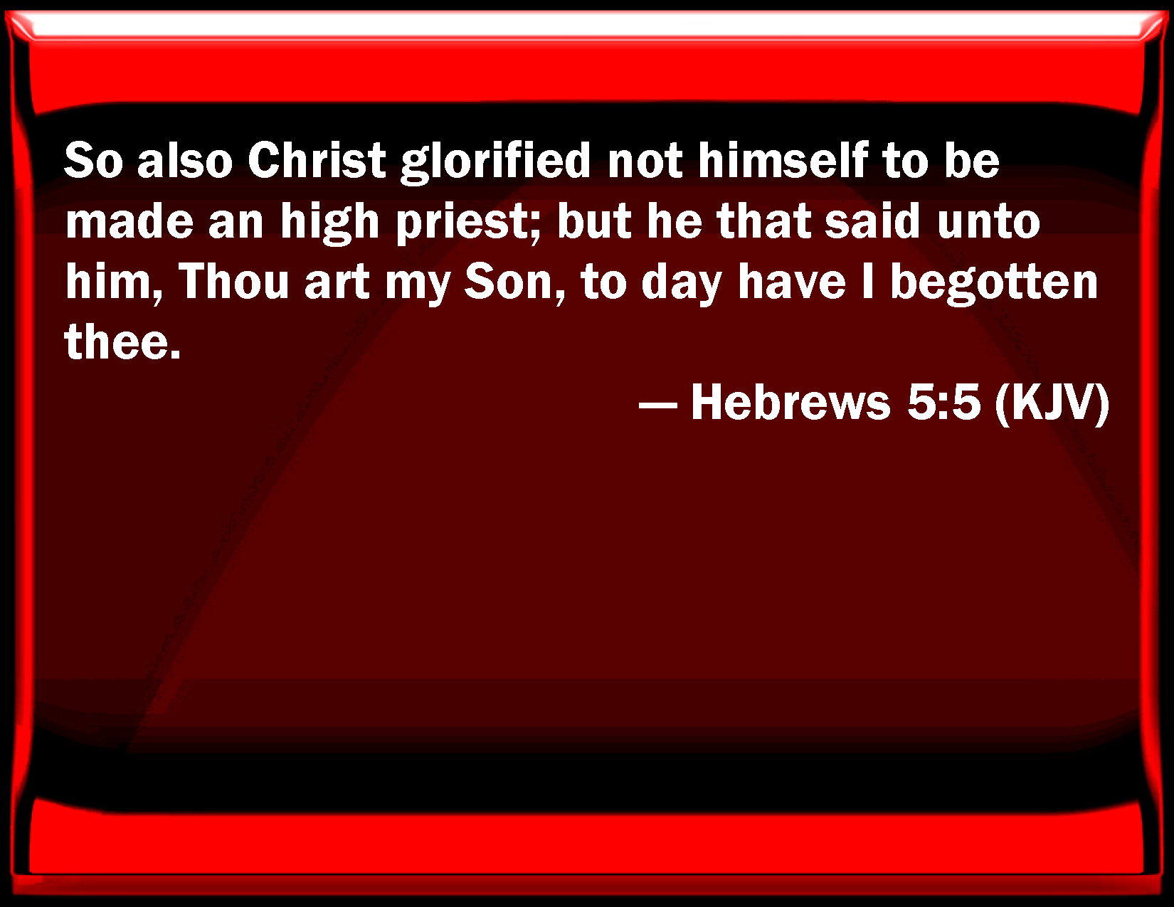 Bible Verse Slide Hebrews 5:5 So also Christ glorified not himself to be made an high priest; but he that said to him, You are my Son, to day have I begotten you. KJV: So also Christ glorified not himself to be made an high priest; but he that said unto him, Thou art my Son, to day have I begotten thee. DRB: So Christ also did not glorify himself, that he might be made a high priest: but he that said unto him: Thou art my Son, this day have I begotten thee. DBT: Thus the Christ also has not glorified himself to be made a high priest; but he who had said to him, Thou art my Son, I have to-day begotten thee. ERV: So Christ also glorified not himself to be made a high priest, but he that spake unto him, Thou art my Son, This day have I begotten thee: WBT: So also Christ glorified not himself to be made a high priest; but he that said to him, Thou art my Son, to-day have I begotten thee. WEB: So also Christ didn't glorify himself to be made a high priest, but it was he who said to him, "You are my Son. Today I have become your father." YLT: so also the Christ did not glorify himself to become chief priest, but He who spake unto him: 'My Son thou art, I to-day have begotten thee;'Links Hebrews 5:5 NIV • Hebrews 5:5 NLT • Hebrews 5:5 ESV • Hebrews 5:5 NASB • Hebrews 5:5 KJV • Hebrews 5:5 Interlinear • Hebrews 5:5 Commentaries • Hebrews 5:5 Parallel Texts • Hebrews 5:5 Bible Apps • Hebrews 5:5 Parallel • Bible Hub |