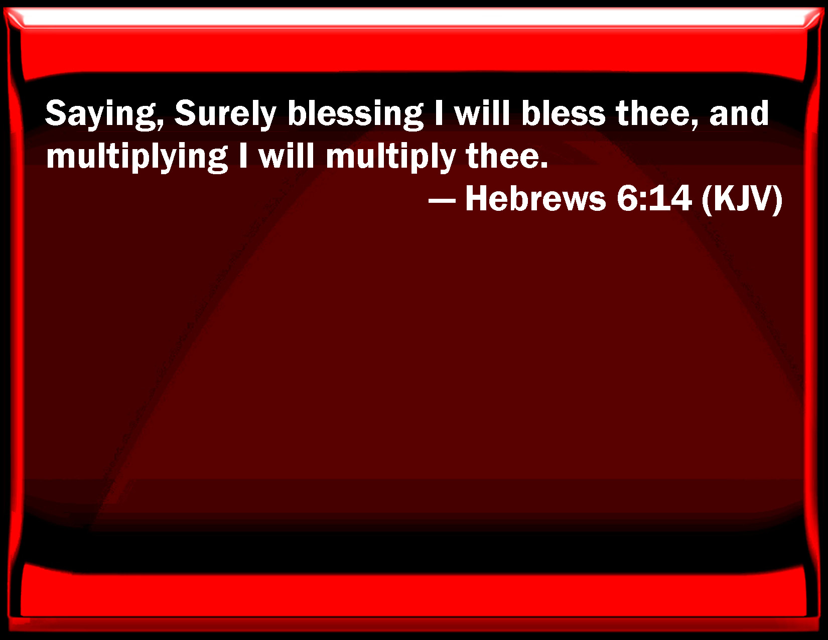 Bible Verse Slide Hebrews 6:14 Saying, Surely blessing I will bless you, and multiplying I will multiply you. KJV: Saying, Surely blessing I will bless thee, and multiplying I will multiply thee. DRB: Saying: Unless blessing I shall bless thee, and multiplying I shall multiply thee. DBT: saying, Surely blessing I will bless thee, and multiplying I will multiply thee; ERV: saying, Surely blessing I will bless thee, and multiplying I will multiply thee. WBT: Saying, Surely blessing I will bless thee, and multiplying I will multiply thee. WEB: saying, "Surely blessing I will bless you, and multiplying I will multiply you." YLT: saying, 'Blessing indeed I will bless thee, and multiplying I will multiply thee;'Links Hebrews 6:14 NIV • Hebrews 6:14 NLT • Hebrews 6:14 ESV • Hebrews 6:14 NASB • Hebrews 6:14 KJV • Hebrews 6:14 Interlinear • Hebrews 6:14 Commentaries • Hebrews 6:14 Parallel Texts • Hebrews 6:14 Bible Apps • Hebrews 6:14 Parallel • Bible Hub |