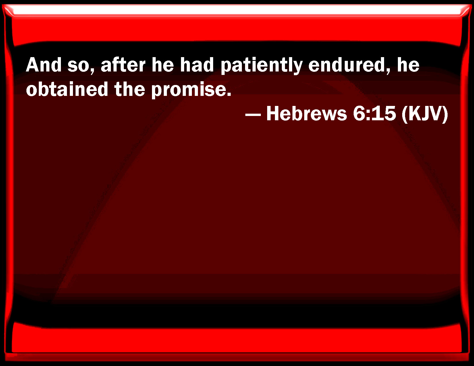 Bible Verse Slide Hebrews 6:15 And so, after he had patiently endured, he obtained the promise. KJV: And so, after he had patiently endured, he obtained the promise. DRB: And so patiently enduring he obtained the promise. DBT: and thus, having had long patience, he got the promise. ERV: And thus, having patiently endured, he obtained the promise. WBT: And so, after he had patiently endured, he obtained the promise. WEB: Thus, having patiently endured, he obtained the promise. YLT: and so, having patiently endured, he did obtain the promise;Links Hebrews 6:15 NIV • Hebrews 6:15 NLT • Hebrews 6:15 ESV • Hebrews 6:15 NASB • Hebrews 6:15 KJV • Hebrews 6:15 Interlinear • Hebrews 6:15 Commentaries • Hebrews 6:15 Parallel Texts • Hebrews 6:15 Bible Apps • Hebrews 6:15 Parallel • Bible Hub |