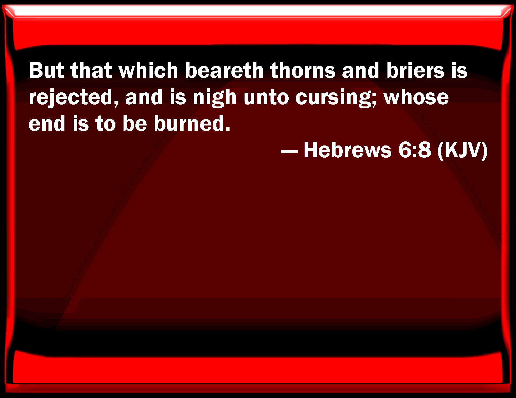 Bible Verse Slide Hebrews 6:8 But that which bears thorns and briers is rejected, and is near to cursing; whose end is to be burned. KJV: But that which beareth thorns and briers is rejected, and is nigh unto cursing; whose end is to be burned. DRB: But that which bringeth forth thorns and briers, is reprobate, and very near unto a curse, whose end is to be burnt. DBT: but bringing forth thorns and briars, it is found worthless and nigh to a curse, whose end is to be burned. ERV: but if it beareth thorns and thistles, it is rejected and nigh unto a curse; whose end is to be burned. WBT: But that which beareth thorns and briers is rejected, and is nigh to cursing; whose end is to be burned. WEB: but if it bears thorns and thistles, it is rejected and near being cursed, whose end is to be burned. YLT: and that which is bearing thorns and briers is disapproved of, and nigh to cursing, whose end is for burning;Links Hebrews 6:8 NIV • Hebrews 6:8 NLT • Hebrews 6:8 ESV • Hebrews 6:8 NASB • Hebrews 6:8 KJV • Hebrews 6:8 Interlinear • Hebrews 6:8 Commentaries • Hebrews 6:8 Parallel Texts • Hebrews 6:8 Bible Apps • Hebrews 6:8 Parallel • Bible Hub |