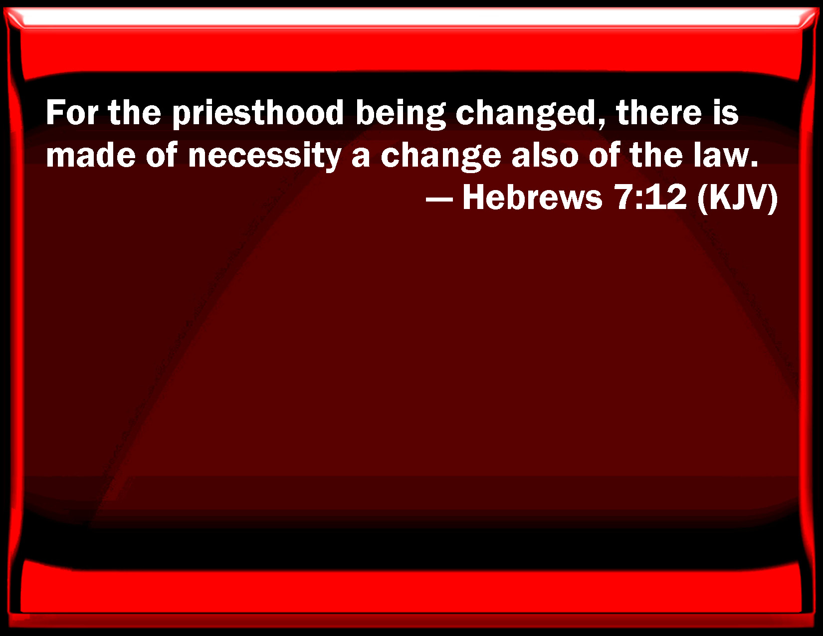 Bible Verse Slide Hebrews 7:12 For the priesthood being changed, there is made of necessity a change also of the law. KJV: For the priesthood being changed, there is made of necessity a change also of the law. DRB: For the priesthood being translated, it is necessary that a translation also be made of the law. DBT: For, the priesthood being changed, there takes place of necessity a change of law also. ERV: For the priesthood being changed, there is made of necessity a change also of the law. WBT: For the priesthood being changed, there is made of necessity a change also of the law. WEB: For the priesthood being changed, there is of necessity a change made also in the law. YLT: for the priesthood being changed, of necessity also, of the law a change doth come,Links Hebrews 7:12 NIV • Hebrews 7:12 NLT • Hebrews 7:12 ESV • Hebrews 7:12 NASB • Hebrews 7:12 KJV • Hebrews 7:12 Interlinear • Hebrews 7:12 Commentaries • Hebrews 7:12 Parallel Texts • Hebrews 7:12 Bible Apps • Hebrews 7:12 Parallel • Bible Hub |