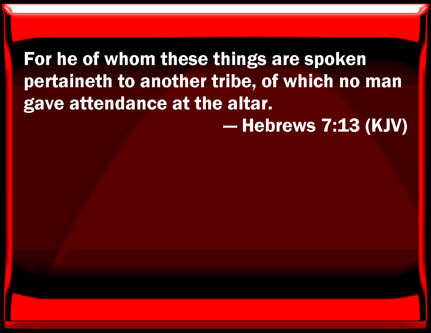 Bible Verse Slide Hebrews 7:13 For he of whom these things are spoken pertains to another tribe, of which no man gave attendance at the altar. KJV: For he of whom these things are spoken pertaineth to another tribe, of which no man gave attendance at the altar. DRB: For he, of whom these things are spoken, is of another tribe, of which no one attended on the altar. DBT: For he, of whom these things are said, belongs to a different tribe, of which no one has ever been attached to the service of the altar. ERV: For he of whom these things are said belongeth to another tribe, from which no man hath given attendance at the altar. WBT: For he of whom these things are spoken pertaineth to another tribe, of which no man gave attendance at the altar. WEB: For he of whom these things are said belongs to another tribe, from which no one has officiated at the altar. YLT: for he of whom these things are said in another tribe hath had part, of whom no one gave attendance at the altar,Links Hebrews 7:13 NIV • Hebrews 7:13 NLT • Hebrews 7:13 ESV • Hebrews 7:13 NASB • Hebrews 7:13 KJV • Hebrews 7:13 Interlinear • Hebrews 7:13 Commentaries • Hebrews 7:13 Parallel Texts • Hebrews 7:13 Bible Apps • Hebrews 7:13 Parallel • Bible Hub |