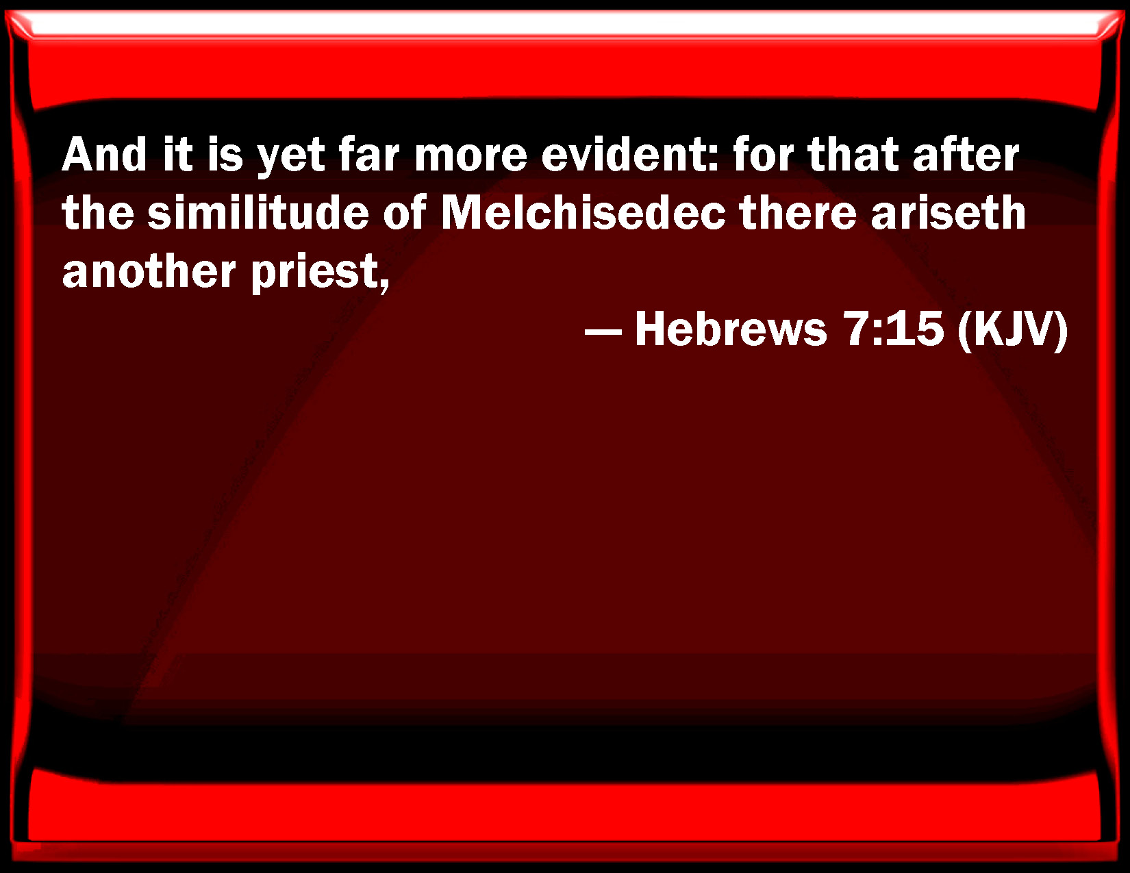 Bible Verse Slide Hebrews 7:15 And it is yet far more evident: for that after the similitude of Melchisedec there rises another priest, KJV: And it is yet far more evident: for that after the similitude of Melchisedec there ariseth another priest, DRB: And it is yet far more evident: if according to the similitude of Melchisedech there ariseth another priest, DBT: And it is yet more abundantly evident, since a different priest arises according to the similitude of Melchisedec, ERV: And what we say is yet more abundantly evident, if after the likeness of Melchizedek there ariseth another priest, WBT: And it is yet far more evident: for that after the similitude of Melchisedec there ariseth another priest, WEB: This is yet more abundantly evident, if after the likeness of Melchizedek there arises another priest, YLT: And it is yet more abundantly most evident, if according to the similitude of Melchisedek there doth arise another priest,Links Hebrews 7:15 NIV • Hebrews 7:15 NLT • Hebrews 7:15 ESV • Hebrews 7:15 NASB • Hebrews 7:15 KJV • Hebrews 7:15 Interlinear • Hebrews 7:15 Commentaries • Hebrews 7:15 Parallel Texts • Hebrews 7:15 Bible Apps • Hebrews 7:15 Parallel • Bible Hub |