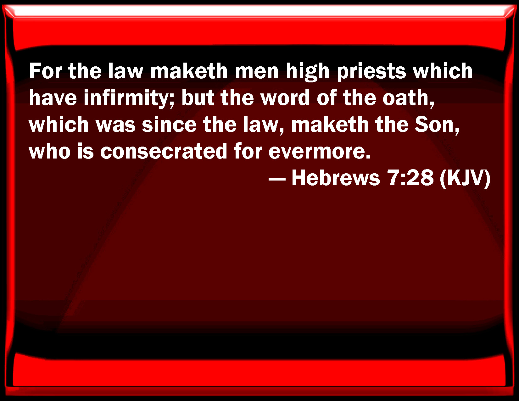 Bible Verse Slide Hebrews 7:28 For the law makes men high priests which have infirmity; but the word of the oath, which was since the law, makes the Son, who is consecrated for ever more. KJV: For the law maketh men high priests which have infirmity; but the word of the oath, which was since the law, maketh the Son, who is consecrated for evermore. DRB: For the law maketh men priests, who have infirmity: but the word of the oath, which was since the law, the Son who is perfected for evermore. DBT: For the law constitutes men high priests, having infirmity; but the word of the swearing of the oath which is after the law, a Son perfected for ever. ERV: For the law appointeth men high priests, having infirmity; but the word of the oath, which was after the law, appointeth a Son, perfected for evermore. WBT: For the law maketh men high priests who have infirmity; but the word of the oath, which was after the law, maketh the Son, who is consecrated for evermore. WEB: For the law appoints men as high priests who have weakness, but the word of the oath which came after the law appoints a Son forever who has been perfected. YLT: for the law doth appoint men chief priests, having infirmity, but the word of the oath that is after the law appointeth the Son — to the age having been perfected.Links Hebrews 7:28 NIV • Hebrews 7:28 NLT • Hebrews 7:28 ESV • Hebrews 7:28 NASB • Hebrews 7:28 KJV • Hebrews 7:28 Interlinear • Hebrews 7:28 Commentaries • Hebrews 7:28 Parallel Texts • Hebrews 7:28 Bible Apps • Hebrews 7:28 Parallel • Bible Hub |