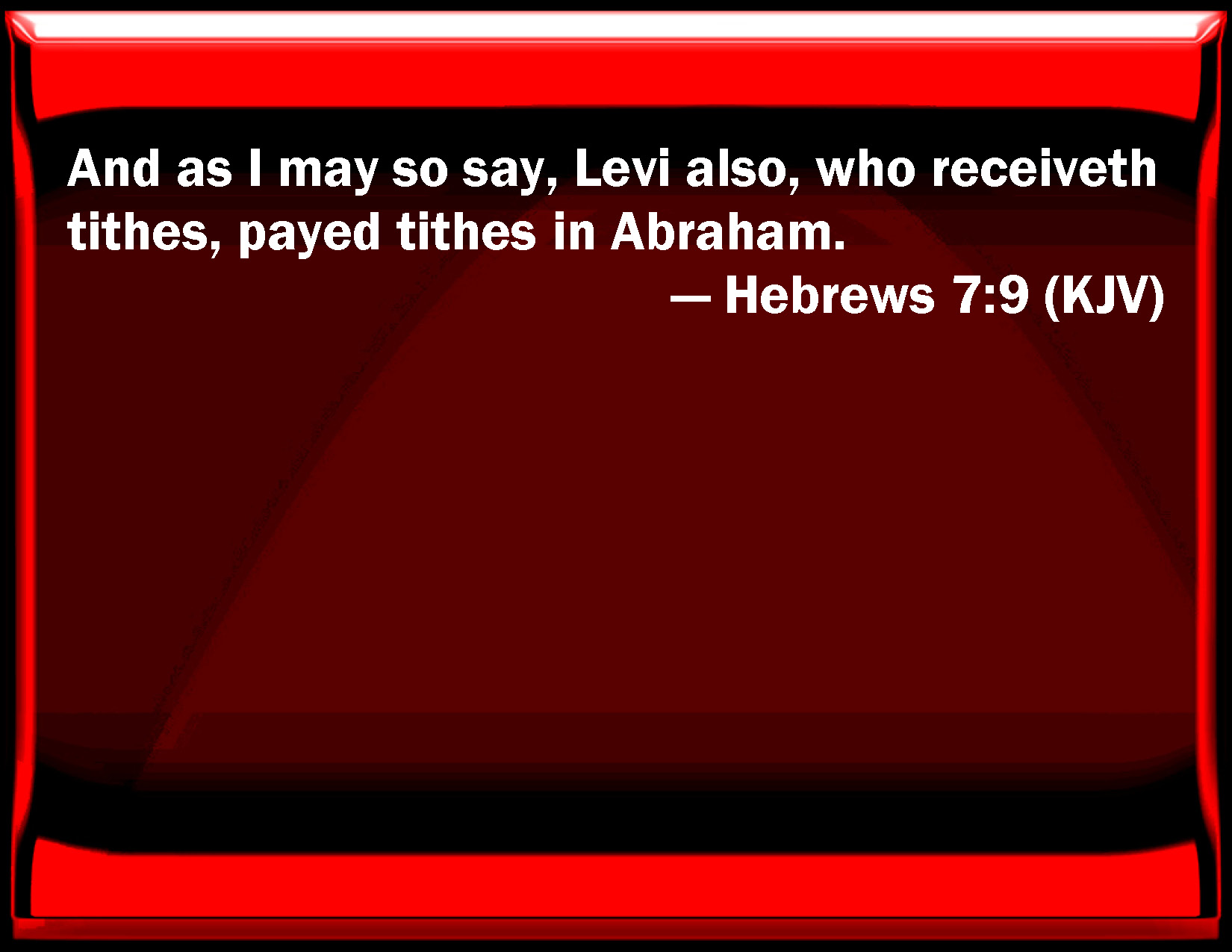 Bible Verse Slide Hebrews 7:9 And as I may so say, Levi also, who receives tithes, paid tithes in Abraham. KJV: And as I may so say, Levi also, who receiveth tithes, payed tithes in Abraham. DRB: And (as it may be said) even Levi who received tithes, paid tithes in Abraham: DBT: and, so to speak, through Abraham, Levi also, who received tithes, has been made to pay tithes. ERV: And, so to say, through Abraham even Levi, who receiveth tithes, hath paid tithes; WBT: And as I may say, Levi also, who receiveth tithes, payed tithes in Abraham. WEB: We can say that through Abraham even Levi, who receives tithes, has paid tithes, YLT: and so to speak, through Abraham even Levi who is receiving tithes, hath paid tithes,Links Hebrews 7:9 NIV • Hebrews 7:9 NLT • Hebrews 7:9 ESV • Hebrews 7:9 NASB • Hebrews 7:9 KJV • Hebrews 7:9 Interlinear • Hebrews 7:9 Commentaries • Hebrews 7:9 Parallel Texts • Hebrews 7:9 Bible Apps • Hebrews 7:9 Parallel • Bible Hub |