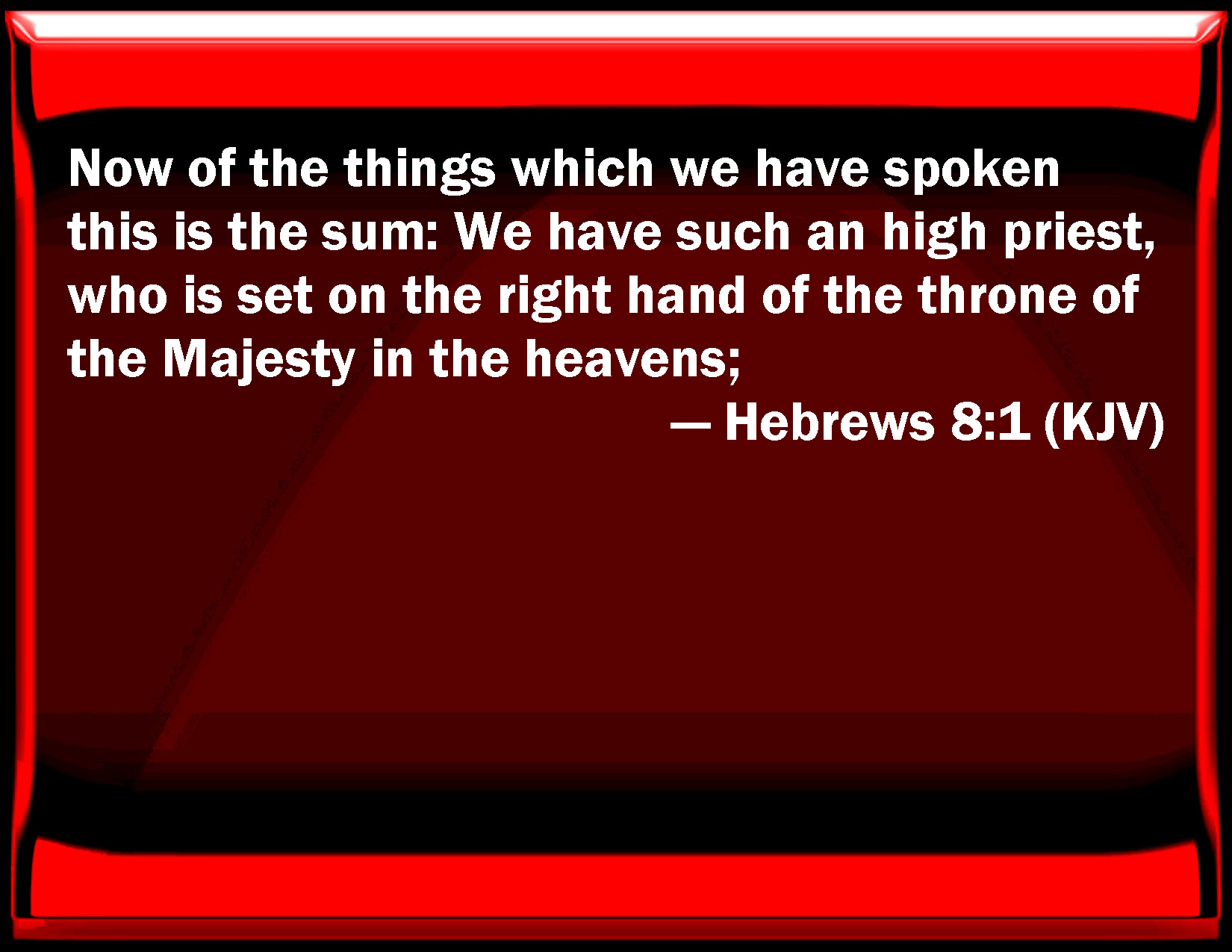 Bible Verse Slide Hebrews 8:1 Now of the things which we have spoken this is the sum: We have such an high priest, who is set on the right hand of the throne of the Majesty in the heavens; KJV: Now of the things which we have spoken this is the sum: We have such an high priest, who is set on the right hand of the throne of the Majesty in the heavens; DRB: Now of the things which we have spoken, this is the sum: We have such an high priest, who is set on the right hand of the throne of majesty in the heavens, DBT: Now a summary of the things of which we are speaking is, We have such a one high priest who has sat down on the right hand of the throne of the greatness in the heavens; ERV: Now in the things which we are saying the chief point is this: We have such a high priest, who sat down on the right hand of the throne of the Majesty in the heavens, WBT: Now of the things which we have spoken this is the sum: We have such a high priest, who is set on the right hand of the throne of the Majesty in the heavens; WEB: Now in the things which we are saying, the main point is this. We have such a high priest, who sat down on the right hand of the throne of the Majesty in the heavens, YLT: And the sum concerning the things spoken of is: we have such a chief priest, who did sit down at the right hand of the throne of the greatness in the heavens,Links Hebrews 8:1 NIV • Hebrews 8:1 NLT • Hebrews 8:1 ESV • Hebrews 8:1 NASB • Hebrews 8:1 KJV • Hebrews 8:1 Interlinear • Hebrews 8:1 Commentaries • Hebrews 8:1 Parallel Texts • Hebrews 8:1 Bible Apps • Hebrews 8:1 Parallel • Bible Hub |