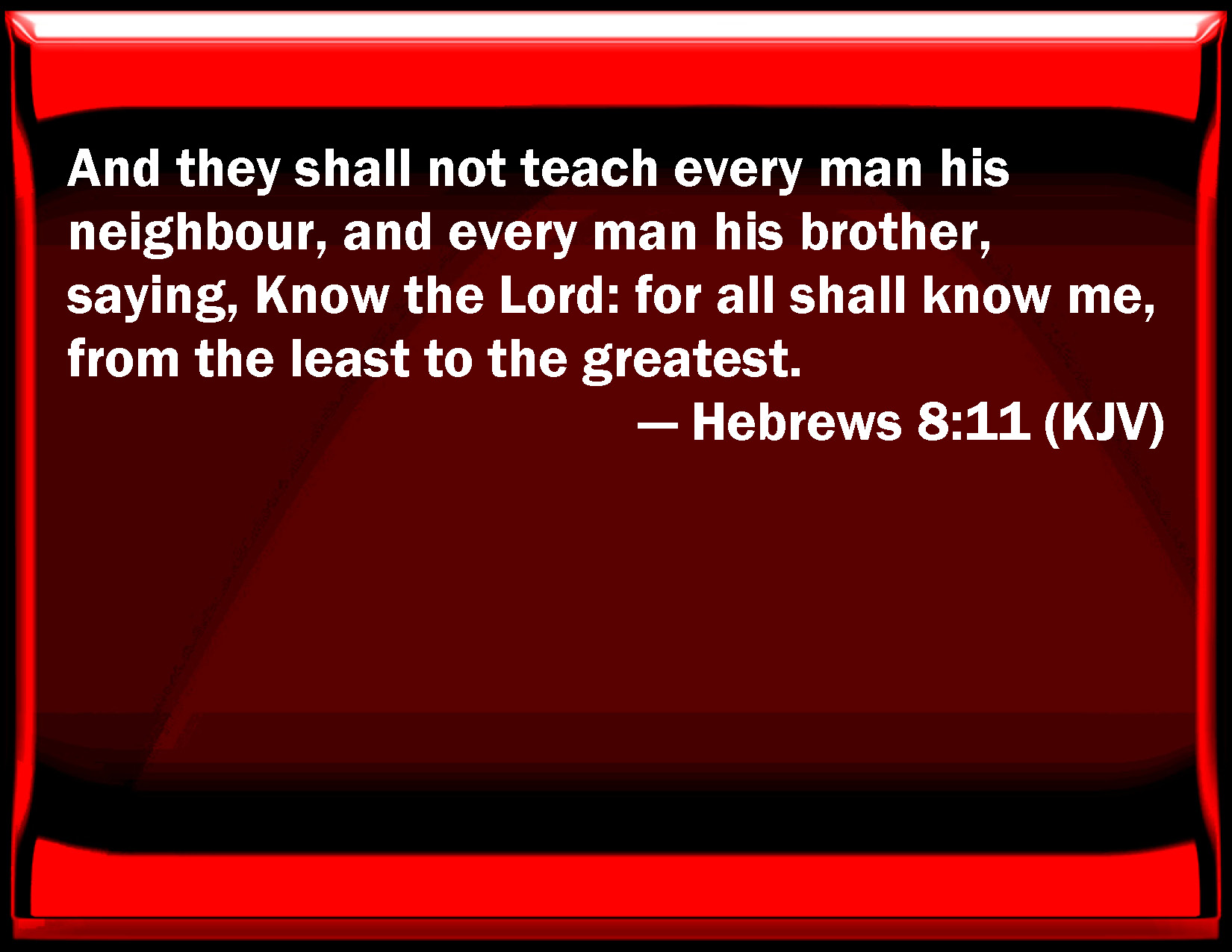 Bible Verse Slide Hebrews 8:11 And they shall not teach every man his neighbor, and every man his brother, saying, Know the Lord: for all shall know me, from the least to the greatest. KJV: And they shall not teach every man his neighbour, and every man his brother, saying, Know the Lord: for all shall know me, from the least to the greatest. DRB: And they shall not teach every man his neighbour and every man his brother, saying, Know the Lord: for all shall know me from the least to the greatest of them: DBT: And they shall not teach each his fellow-citizen, and each his brother, saying, Know the Lord; because all shall know me in themselves, from the little one among them unto the great among them. ERV: And they shall not teach every man his fellow-citizen, And every man his brother, saying, Know the Lord: For all shall know me, From the least to the greatest of them. WBT: And they shall not teach every man his neighbor, and every man his brother, saying, Know the Lord: for all shall know me, from the least to the greatest. WEB: They will not teach every man his fellow citizen, and every man his brother, saying, 'Know the Lord,' for all will know me, from the least of them to the greatest of them. YLT: and they shall not teach each his neighbour, and each his brother, saying, Know thou the Lord, because they shall all know Me from the small one of them unto the great one of them,Links Hebrews 8:11 NIV • Hebrews 8:11 NLT • Hebrews 8:11 ESV • Hebrews 8:11 NASB • Hebrews 8:11 KJV • Hebrews 8:11 Interlinear • Hebrews 8:11 Commentaries • Hebrews 8:11 Parallel Texts • Hebrews 8:11 Bible Apps • Hebrews 8:11 Parallel • Bible Hub |