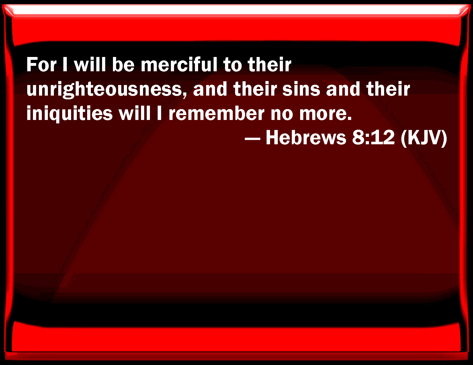 Hebrews 8:12 For I will be merciful to their unrighteousness, and their sins and their iniquities will I remember no more.
