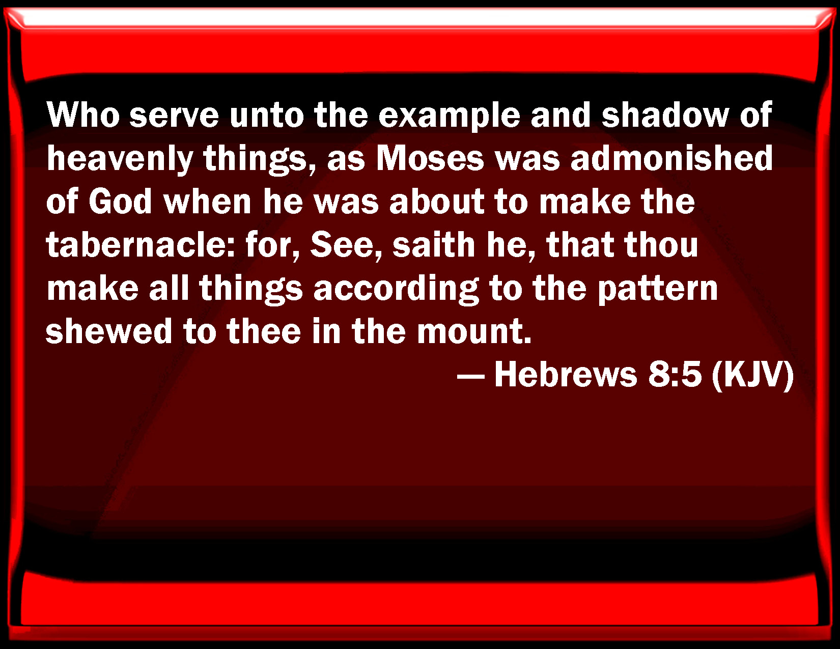 Bible Verse Slide Hebrews 8:5 Who serve to the example and shadow of heavenly things, as Moses was admonished of God when he was about to make the tabernacle: for, See, said he, that you make all things according to the pattern showed to you in the mount. KJV: Who serve unto the example and shadow of heavenly things, as Moses was admonished of God when he was about to make the tabernacle: for, See, saith he, that thou make all things according to the pattern shewed to thee in the mount. DRB: Who serve unto the example and shadow of heavenly things. As it was answered to Moses, when he was to finish the tabernacle: See (saith he) that thou make all things according to the pattern which was shewn thee on the mount. DBT: (who serve the representation and shadow of heavenly things, according as Moses was oracularly told when about to make the tabernacle; for See, saith He, that thou make all things according to the pattern which has been shewn to thee in the mountain.) ERV: who serve that which is a copy and shadow of the heavenly things, even as Moses is warned of God when he is about to make the tabernacle: for, See, saith he, that thou make all things according to the pattern that was shewed thee in the mount. WBT: Who serve to the example and shadow of heavenly things, as Moses was admonished by God when he was about to make the tabernacle: for, See (saith he) that thou make all things according to the pattern shown to thee in the mount. WEB: who serve a copy and shadow of the heavenly things, even as Moses was warned by God when he was about to make the tabernacle, for he said, "See, you shall make everything according to the pattern that was shown to you on the mountain." YLT: who unto an example and shadow do serve of the heavenly things, as Moses hath been divinely warned, being about to construct the tabernacle, for 'See (saith He) thou mayest make all things according to the pattern that was shewn to thee in the mount;') — Links Hebrews 8:5 NIV • Hebrews 8:5 NLT • Hebrews 8:5 ESV • Hebrews 8:5 NASB • Hebrews 8:5 KJV • Hebrews 8:5 Interlinear • Hebrews 8:5 Commentaries • Hebrews 8:5 Parallel Texts • Hebrews 8:5 Bible Apps • Hebrews 8:5 Parallel • Bible Hub |