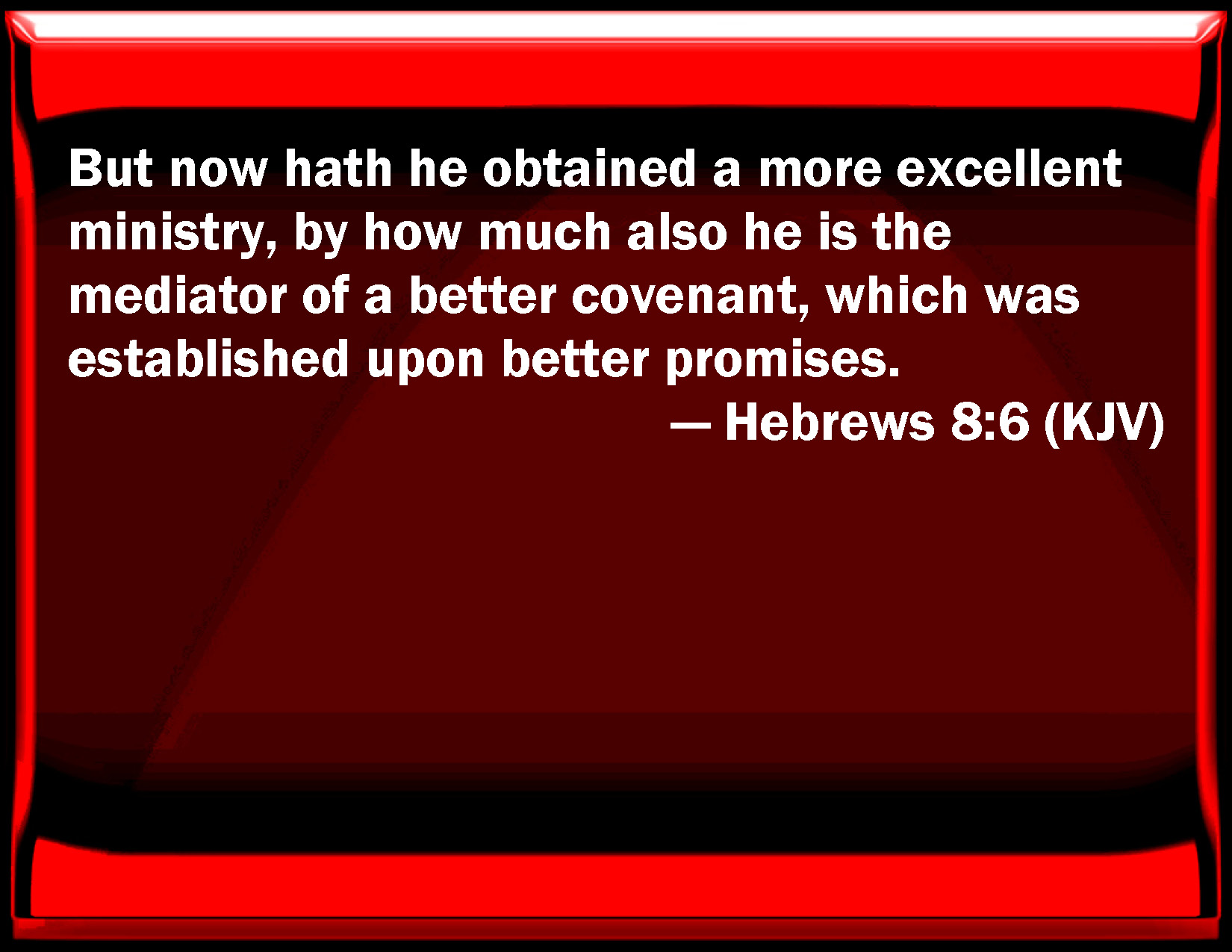 Bible Verse Slide Hebrews 8:6 But now has he obtained a more excellent ministry, by how much also he is the mediator of a better covenant, which was established on better promises. KJV: But now hath he obtained a more excellent ministry, by how much also he is the mediator of a better covenant, which was established upon better promises. DRB: But now he hath obtained a better ministry, by how much also he is a mediator of a better testament, which is established on better promises. DBT: But now he has got a more excellent ministry, by so much as he is mediator of a better covenant, which is established on the footing of better promises. ERV: But now hath he obtained a ministry the more excellent, by how much also he is the mediator of a better covenant, which hath been enacted upon better promises. WBT: But now hath he obtained a more excellent ministry, by how much also he is the mediator of a better covenant, which was established upon better promises. WEB: But now he has obtained a more excellent ministry, by so much as he is also the mediator of a better covenant, which on better promises has been given as law. YLT: and now he hath obtained a more excellent service, how much also of a better covenant is he mediator, which on better promises hath been sanctioned,Links Hebrews 8:6 NIV • Hebrews 8:6 NLT • Hebrews 8:6 ESV • Hebrews 8:6 NASB • Hebrews 8:6 KJV • Hebrews 8:6 Interlinear • Hebrews 8:6 Commentaries • Hebrews 8:6 Parallel Texts • Hebrews 8:6 Bible Apps • Hebrews 8:6 Parallel • Bible Hub |